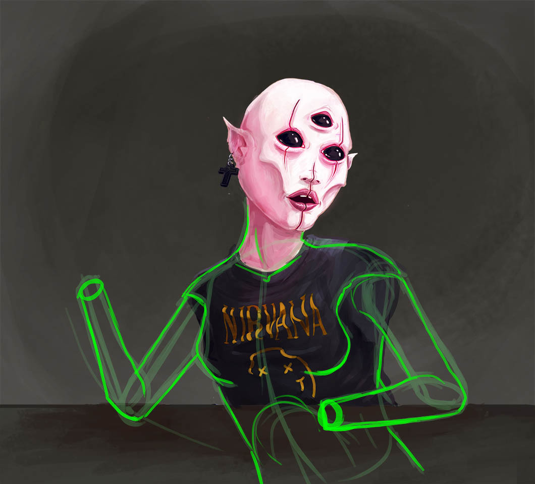 You might ask "but how may I decide?" That's easy! All you have to do is to think what kind of feeling you want to evoke to the viewer. Is she scary? violent? mysterious? sexy? ugly? casual? Then after you decide, think what characteristics can go with that. for example she has on her left arm a wristband. If she is violent put spikes on it. If she is nerdy make it a flashy touchscreen. If she is beatiful put emphasis on her lips etc.