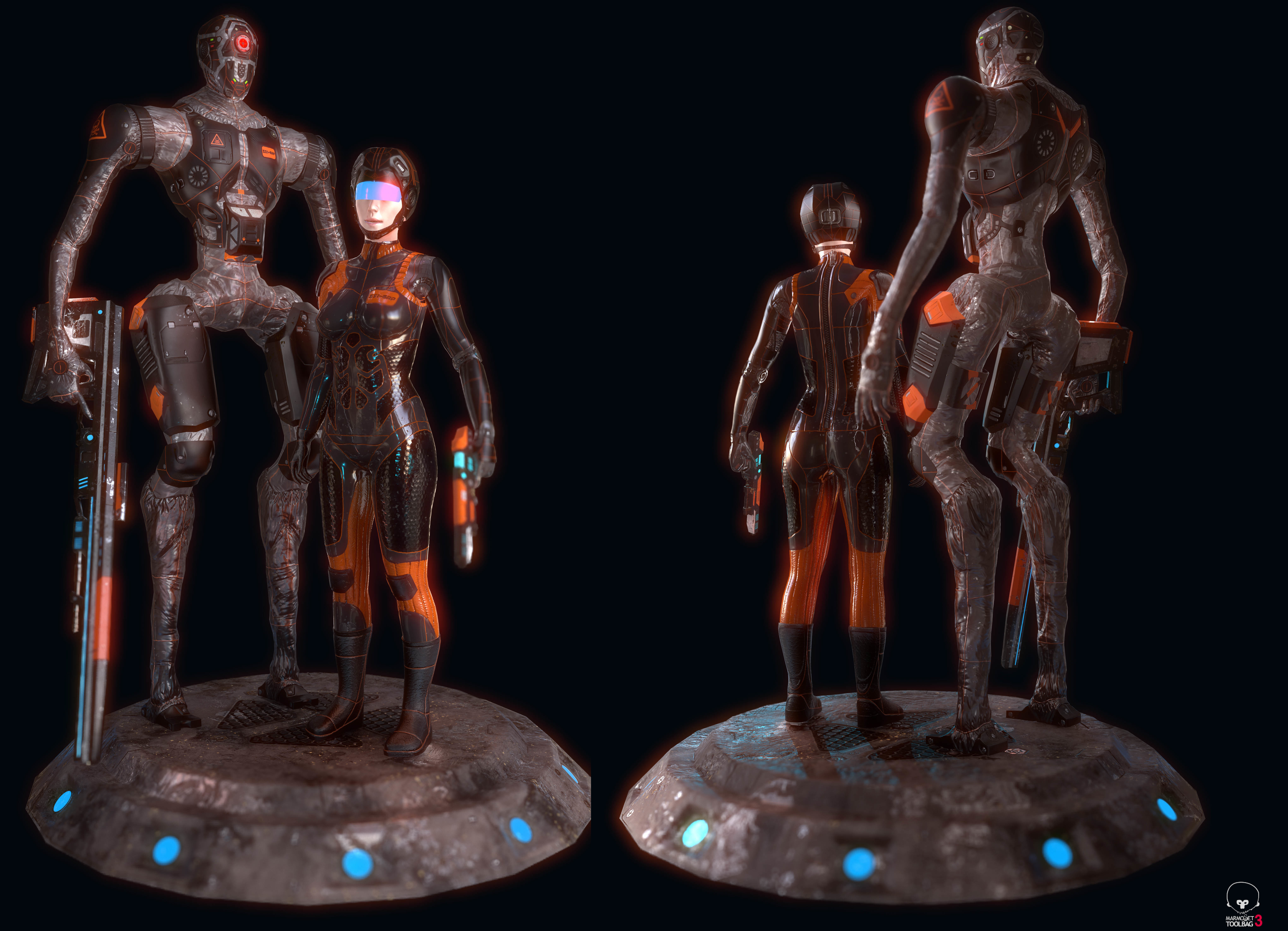 Posing done and I've started rendering in Marmoset. Also I am going to create some platform for the characters they will not "fly" in the render's sky.