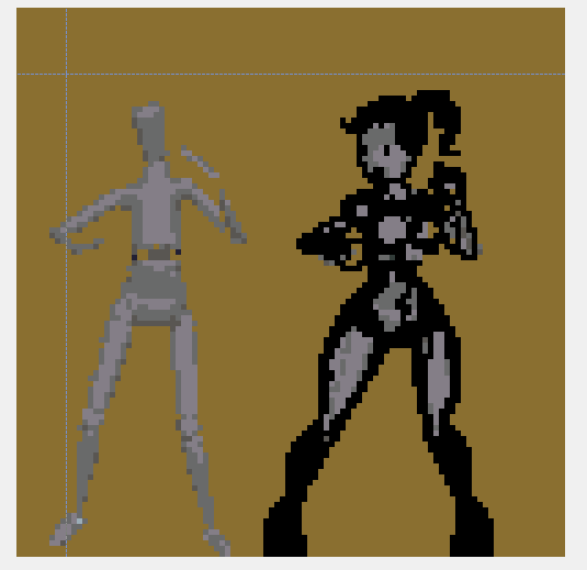 After finding a pose i liked, i rendered the mannequin in a low pixol resolution and took it into graphicsgale. There i used it as a reference to create a rough sketch for a pixel art character: