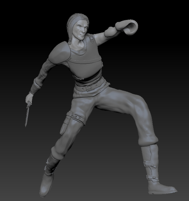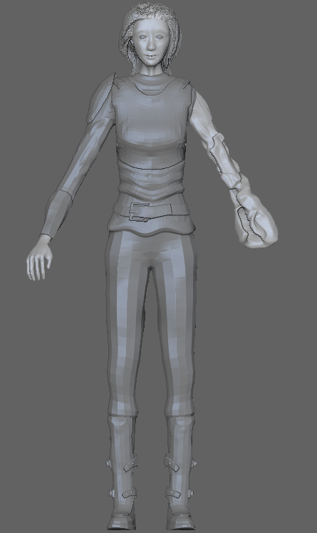 I am going with a lighter armor style, just a breast plate strapped on and belt and boots. My idea is for her to have a dagger, and a mysterious wooden arm cannon-type weapon. That one just right out of messing around in ZBrush and I liked it.