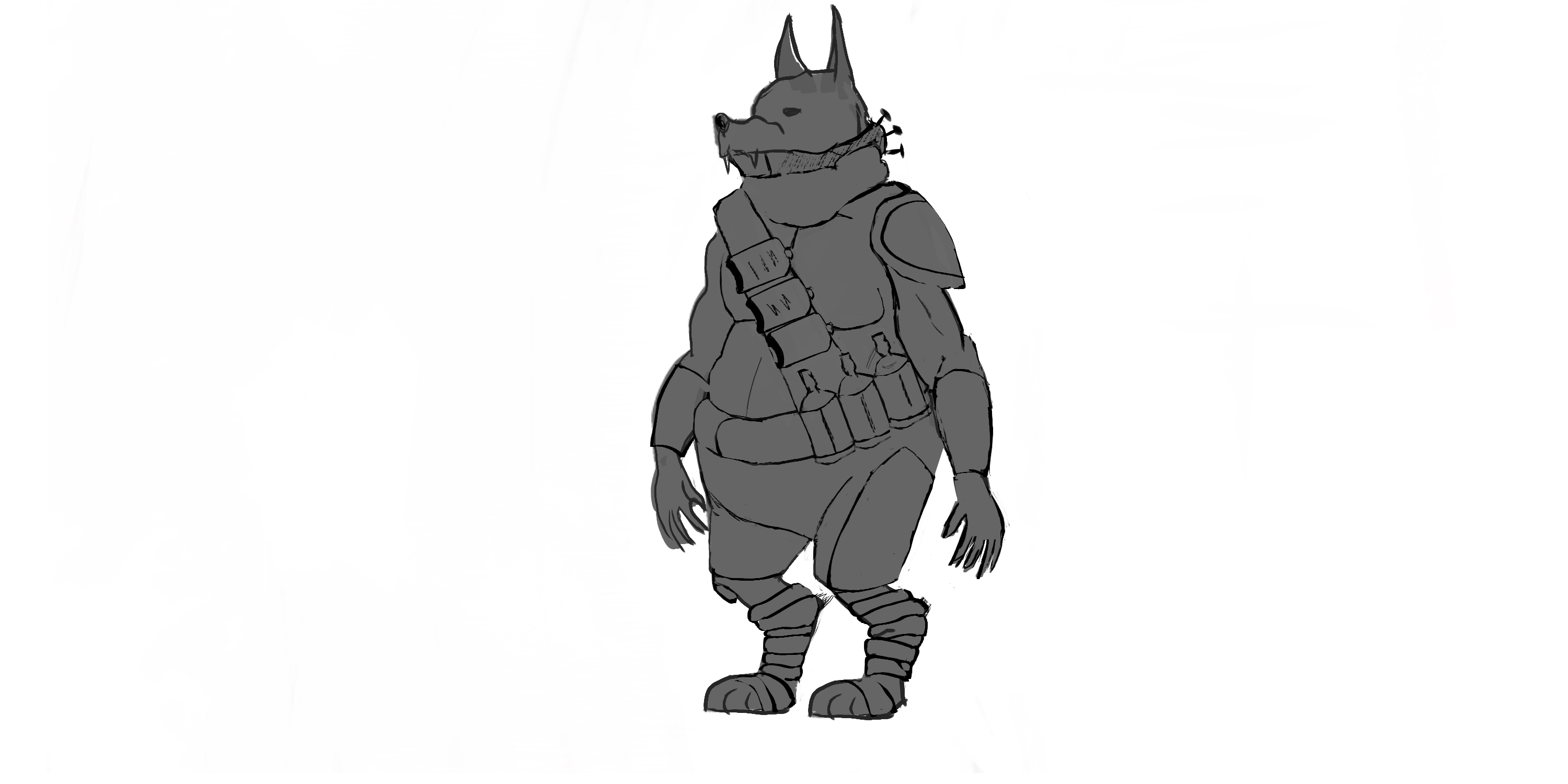 My warrior is kind of like a werewolf except he never turns into a human, he is stuck between his human and wolf form.He has special abilities, I drew inspiration from The Three Little Pigs Big Bad Wolf, Like in the old tales he can take a deep breath and blow everything away. This ability is combined with his profession : fire breather. He has a lot of alcohol bottles that he uses as ammo.To start the fire he has a little gaz tube that he can turn on with a button, he then knocks his teeth together to make the sparks