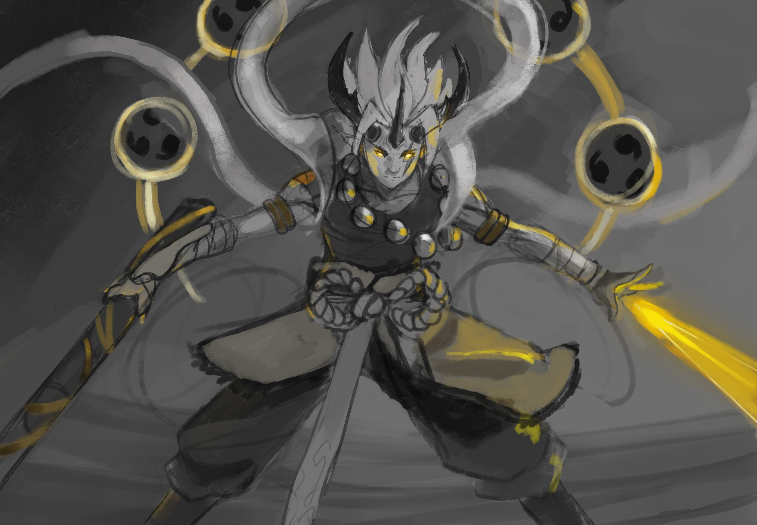 I love how this is looking so far, although it seems the characters are all competing for space in the image, I agree with alexisarroyon7 in that the thumbs were more dyamic but I really think you could push the composition itself more, or even use a different angle of the character shown against these other foes to make it more "fight scene". As it is the finished sketch you have is a little bland, it's head on and like I said it doesn't have much balance! I look forward to seeing what you produce though
