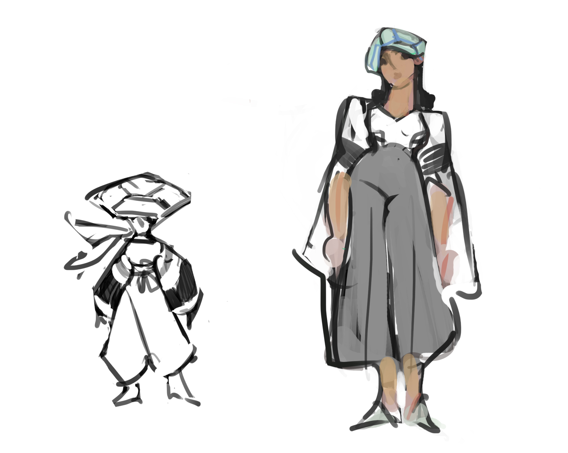 first line of thought for costume design was more aang the airbender inspired, but then the headpiece on the right character give an idea for an artdeco -ish style, so i decided to go in this direction
