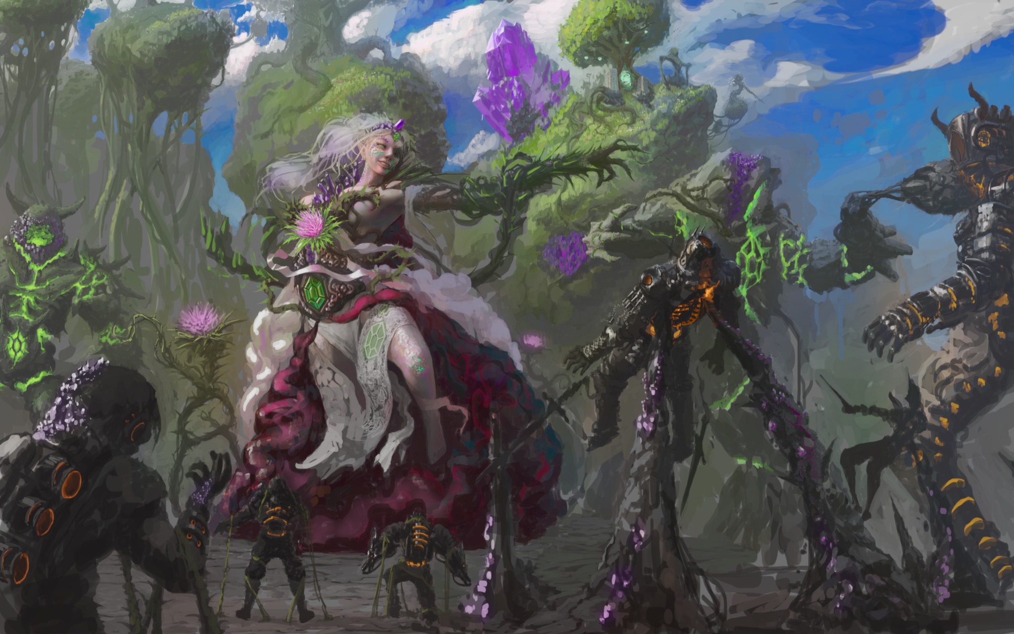 About her design, I'm thinking I want a more "ethereal" or "not-so-human" look. Will try to experiment with her skin and hair color to achieve that, in addition to having parts of her skin look like wood or bark that shifts over to stone + amethyst. That's my current thought anyway, let's see where it goes...