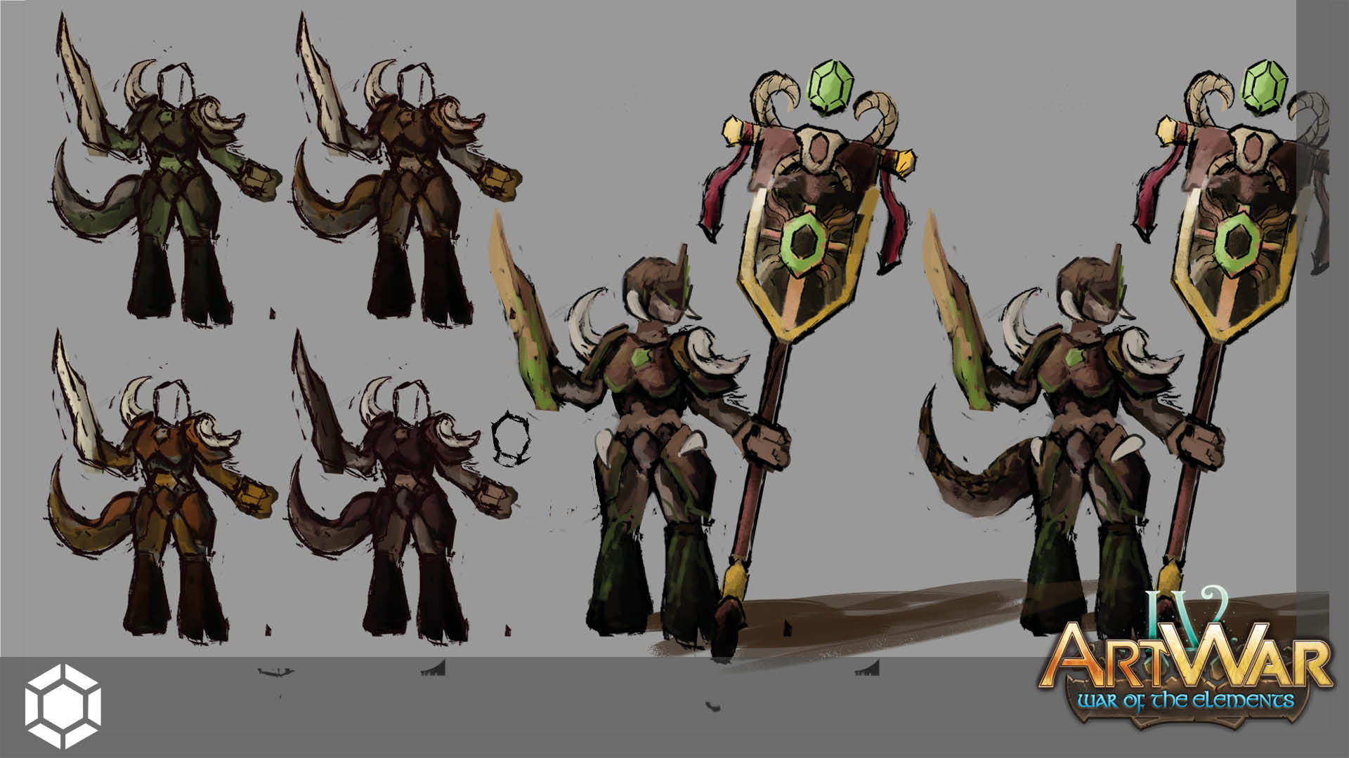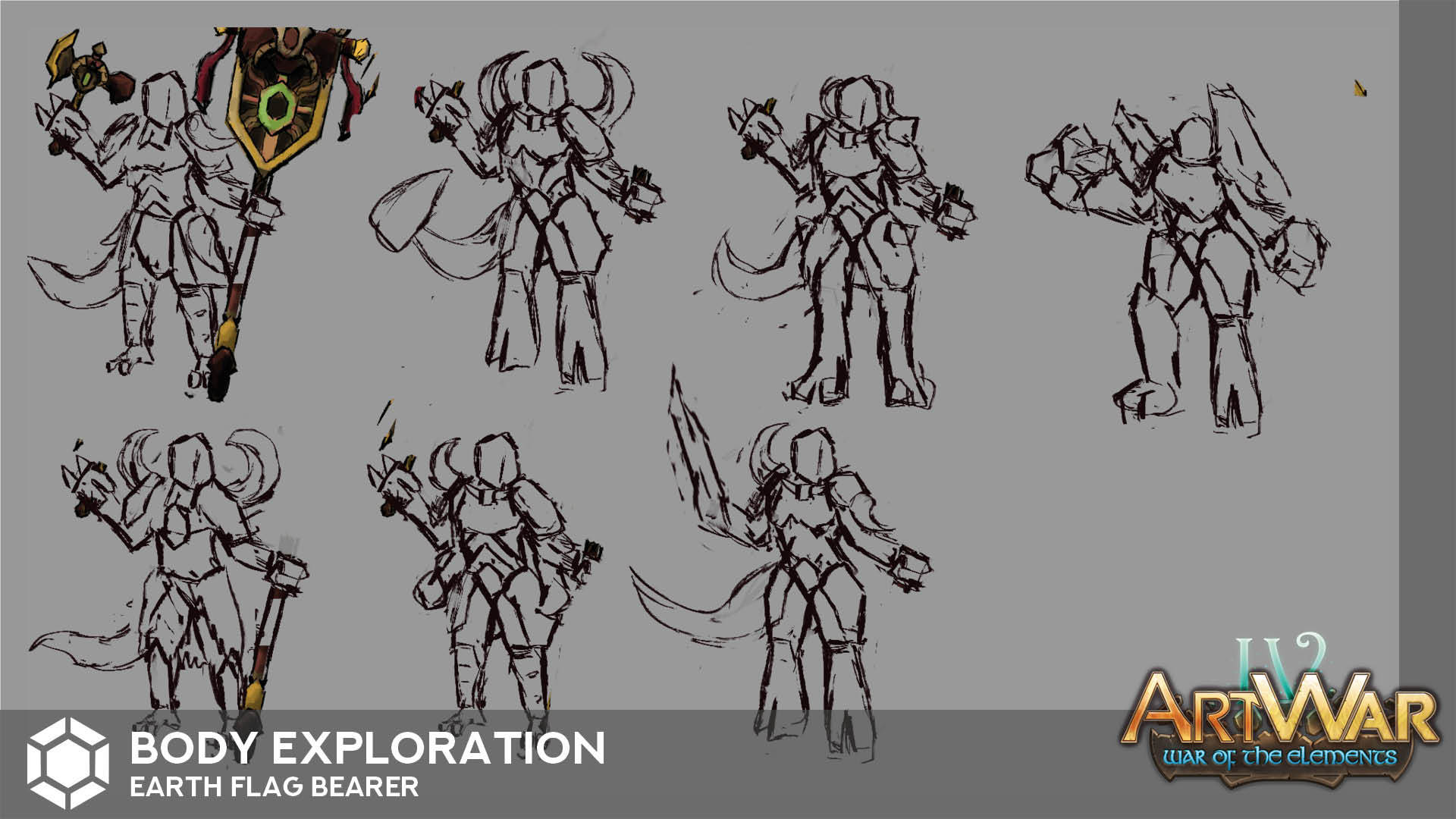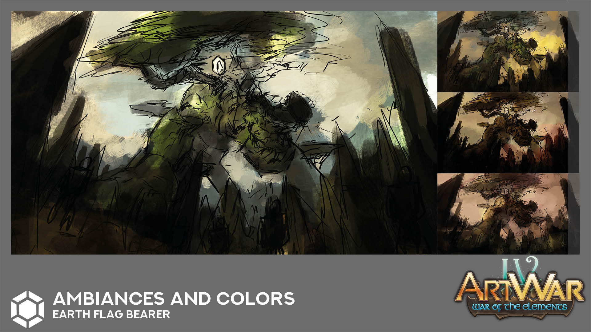 Then I came up with the idea that I should create something only for this purpose, not a humanlike creature with a banner. So I keep the idea of a magical like floating symbol and build a gigantic golem to support it.