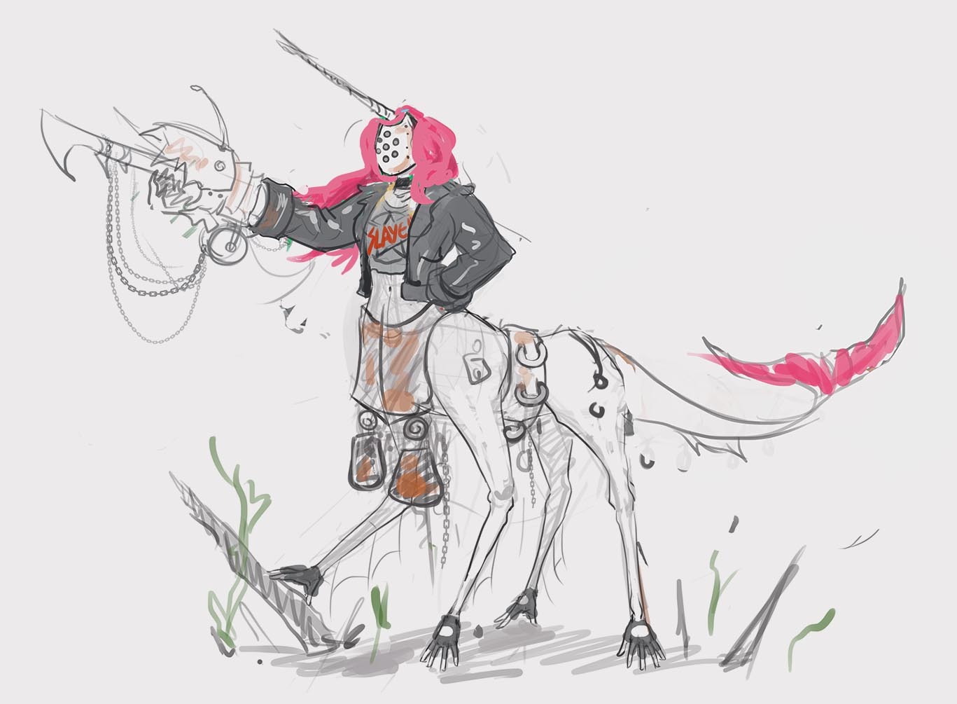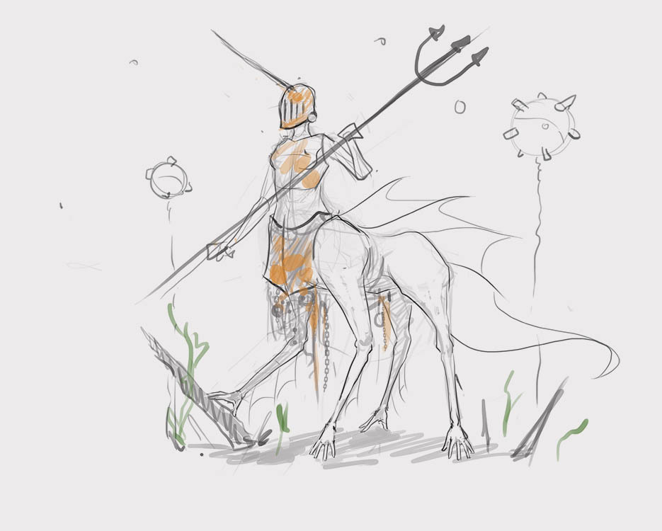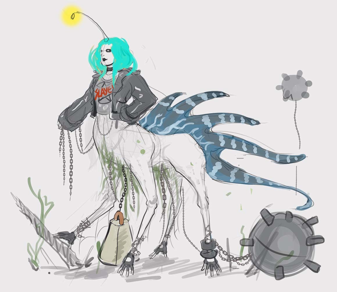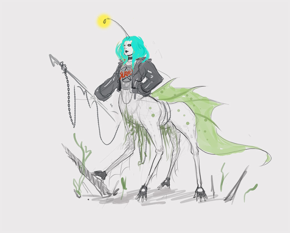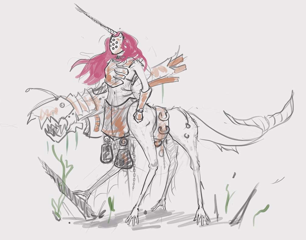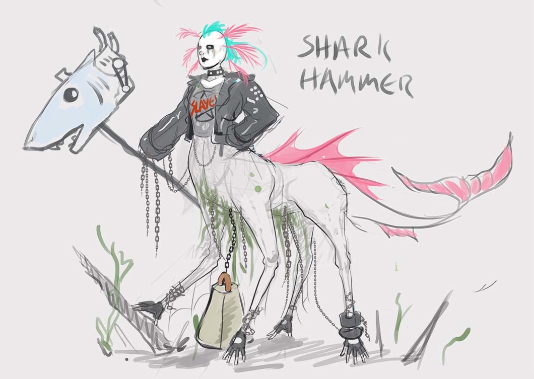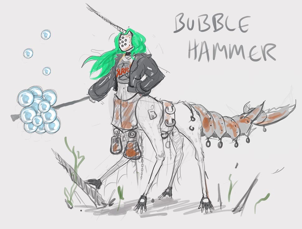 From the very last image, I think the 2nd one from the bottom up (the one with the pink hair and angler-fish cannon) ties closest with the image of a champion for this contest. I think a mixture of medieval armour and punk aesthetics can make for a crazy aesthetic.