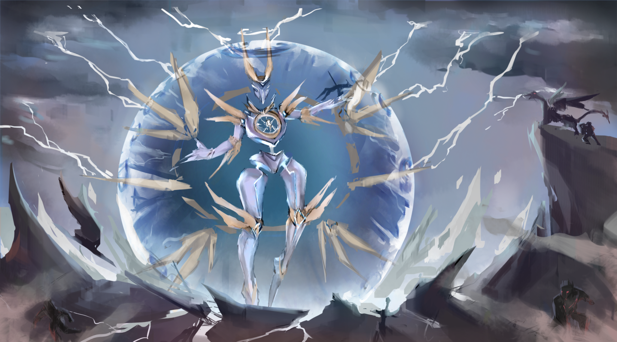 While working on this I realized I was leaning toward an angel savior as a concept, taking away the dying allies and protecting them, so I revisited the sketches and the design. Now I feel a little bit more confident about the storytelling but I'm very concerned about the time, right now I'm rushing so I can have at least 15days for painting the final illustration. I'm so tired by studying and working lol