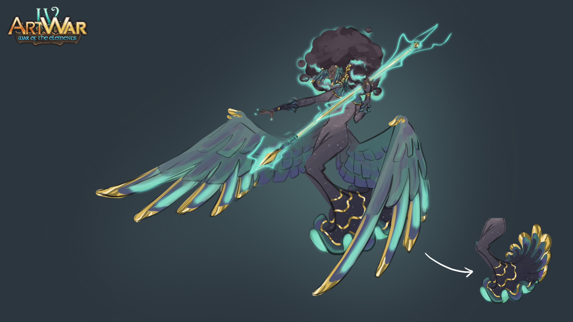 My warrior is from the lightning faction, using spears made from her (cloudy) hair to smite down enemies from the air. The lightning bird is an african myth and I decided to give it a human form for this contest, the spear will be african to reflect that