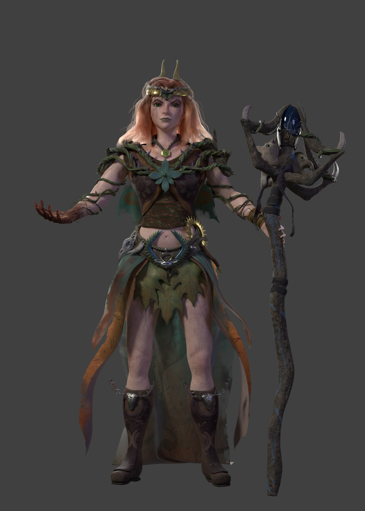A little update on my character. I did most of the textures and started with the hair. I'm also thinking of giving her a nice pet. Just to help her during the battle And I want to create some smoke or green flames in the palm of her wooden hand. So I have to play a bit with the particle system. So, still a lot to do...