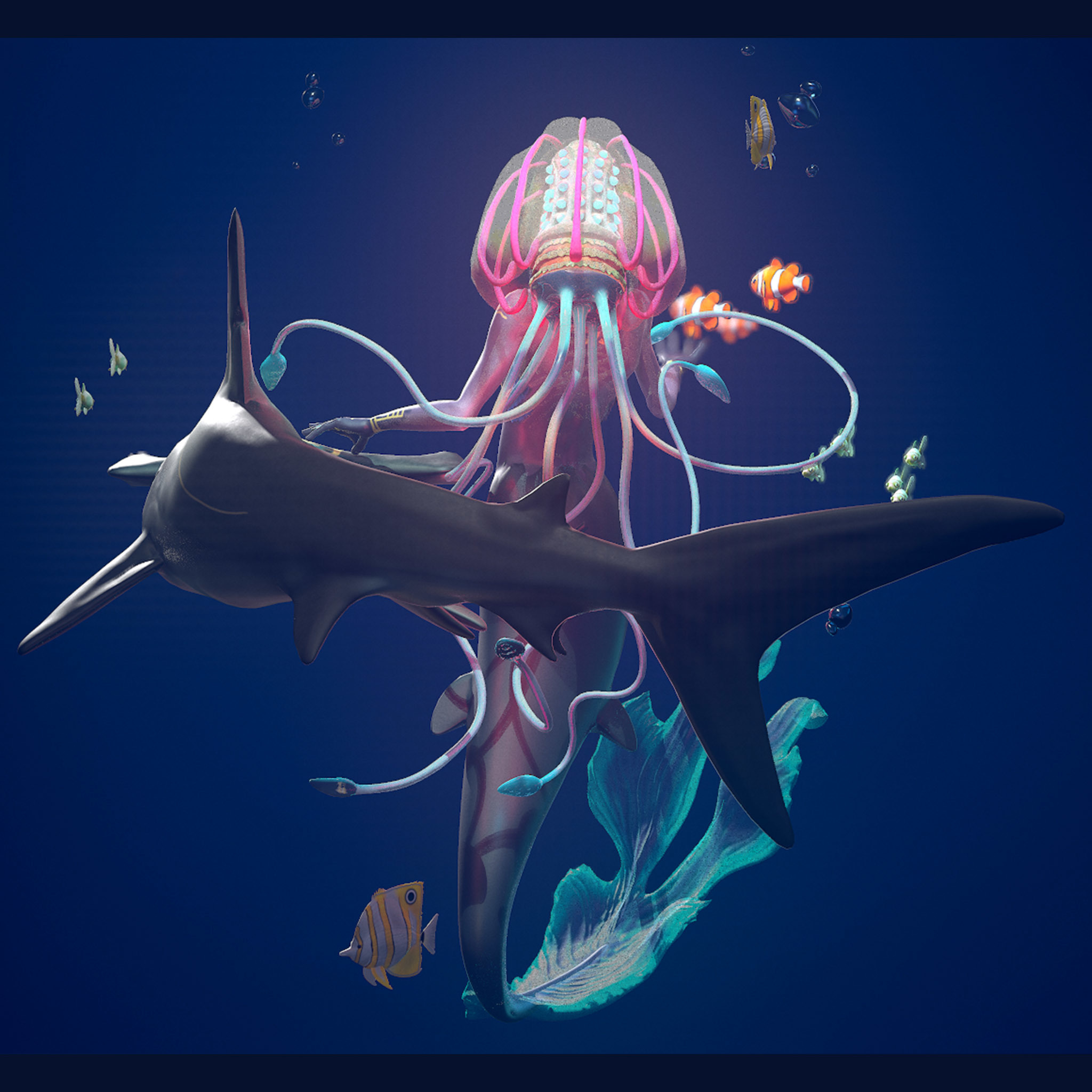 Me agrada la idea de una sirena medusa. Que en partes sea suficientemente transparente que puedes ver los huesos me parece bastante interesante, espero incluyas algo de eso en la version final. Saludos y buen trabajo!