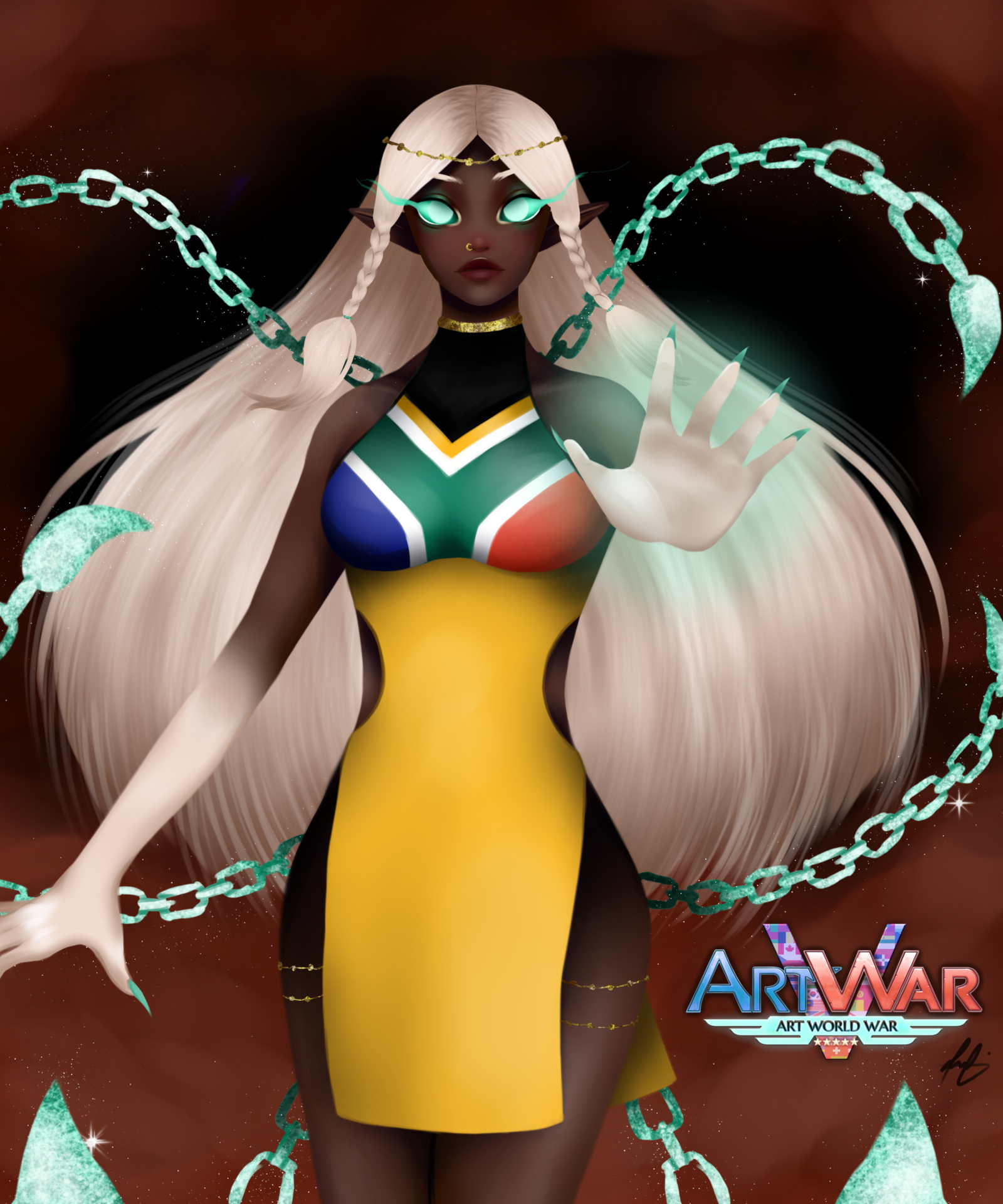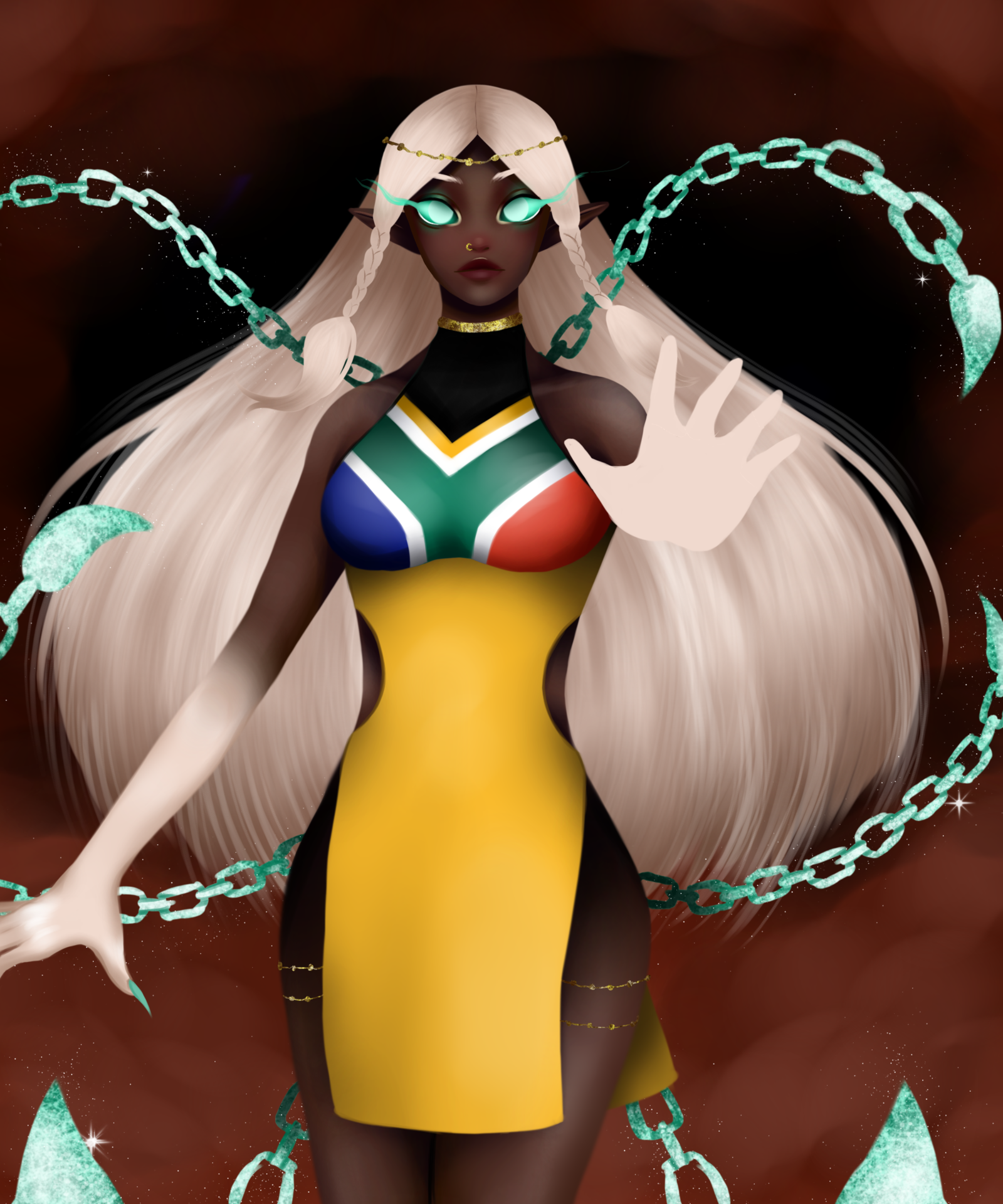 The character name is Mama Chain. She is a symbol of African warrior. She takes her power from diamond in South Africa and control it as a weapon. my instagram art account: snyz.arts
