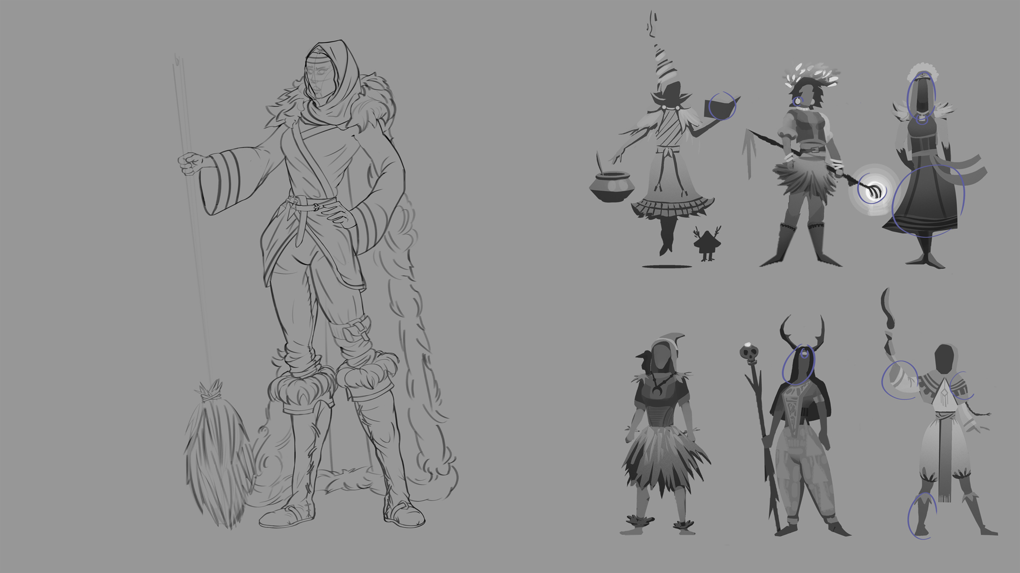 I like the little sketch in the top left corner, for her special head form, also like the whole costume with the deer antlers(?). I think the idea of her wearing a trouser is a cool modern approach to a witch ^^