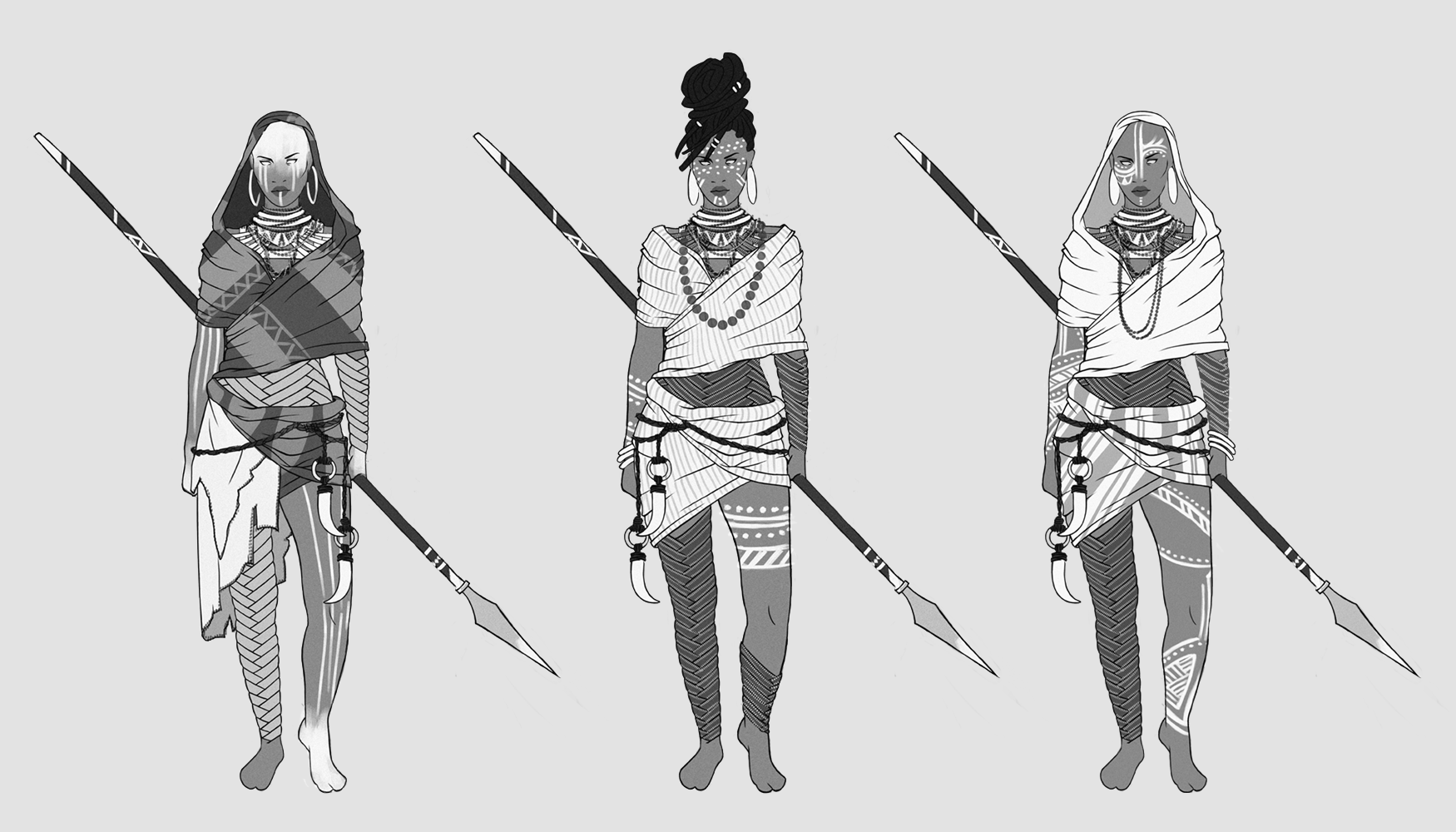 I had a look at amazons in pop culture, found some pictures of Dahomey warriors and since I am not familiar with African cultures, had to do quite a bit of digging, which was really fun - here is a small moodboard of my findings: