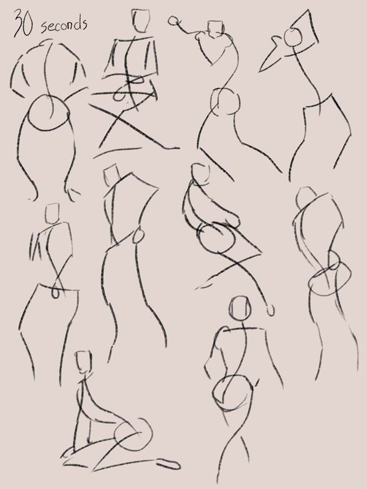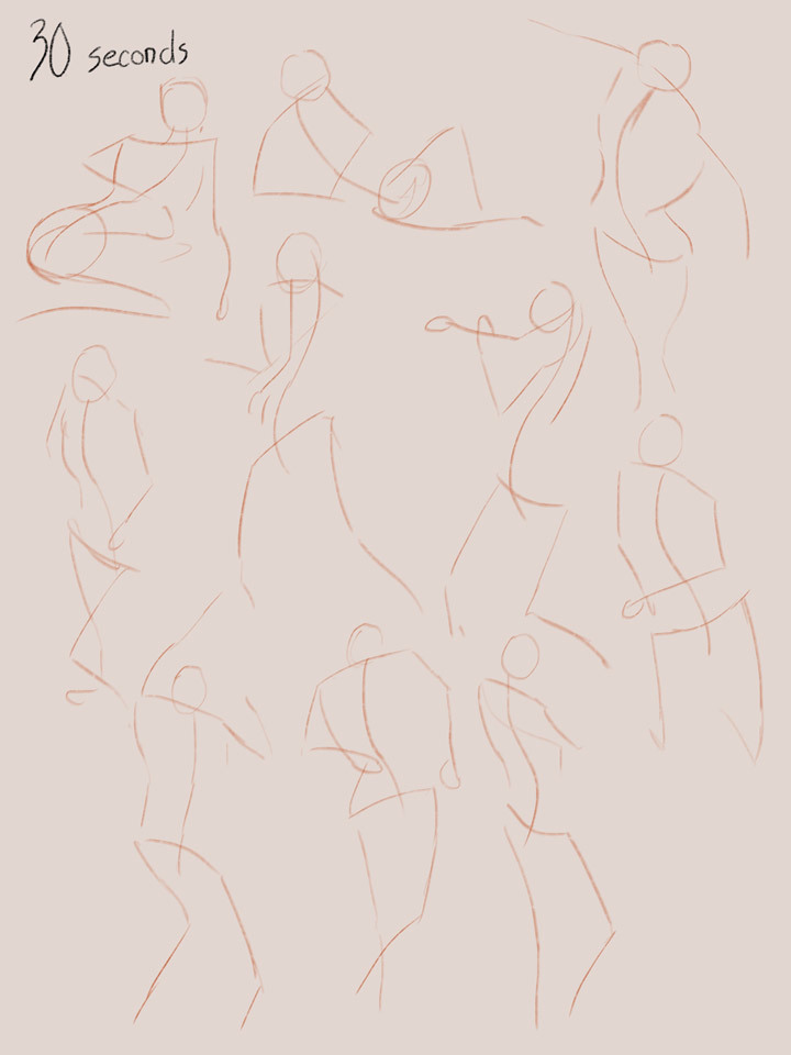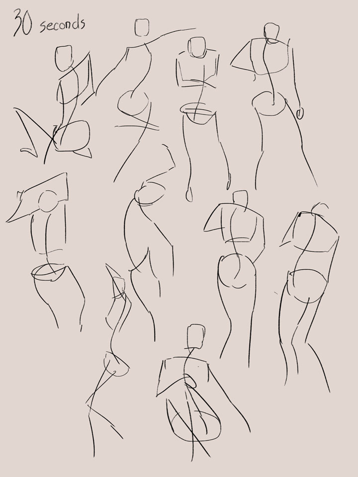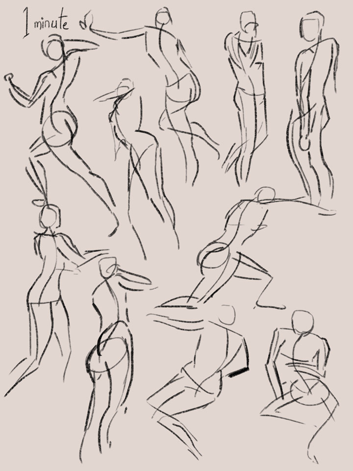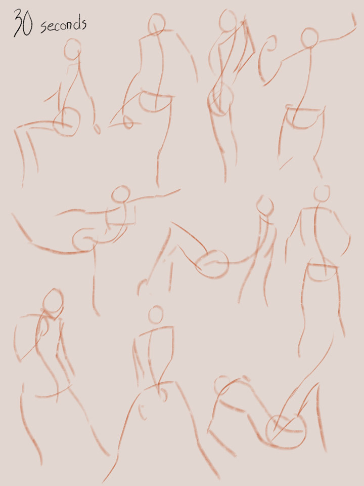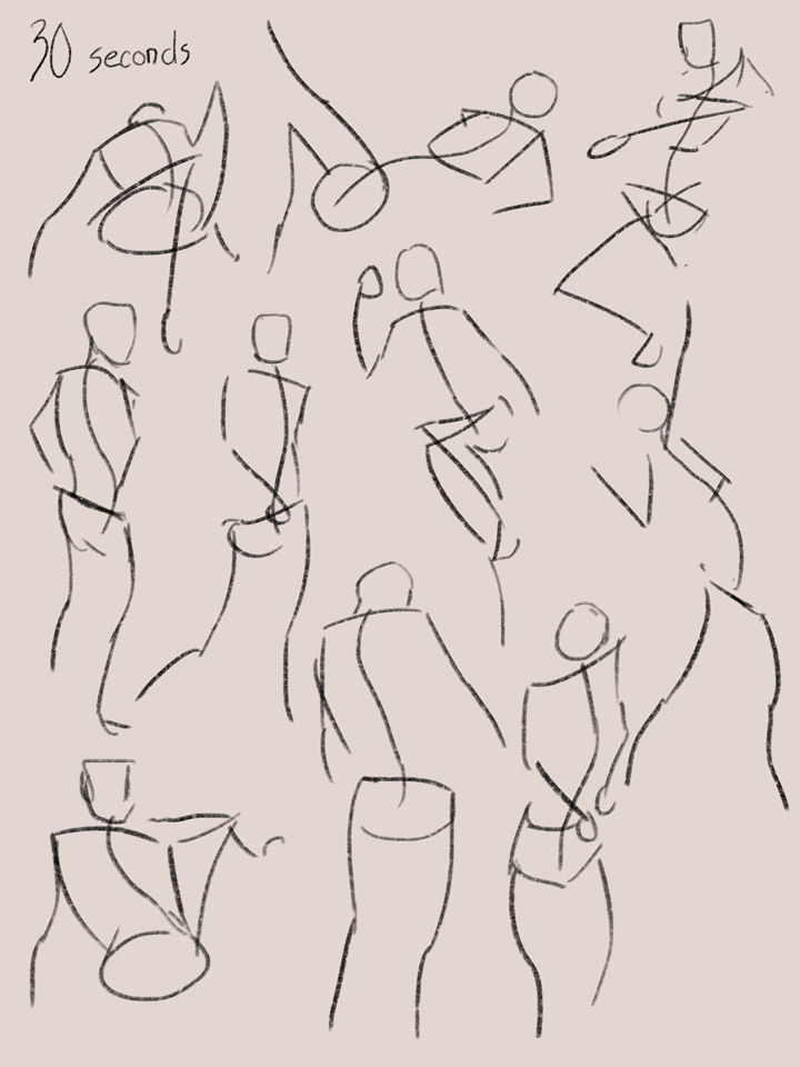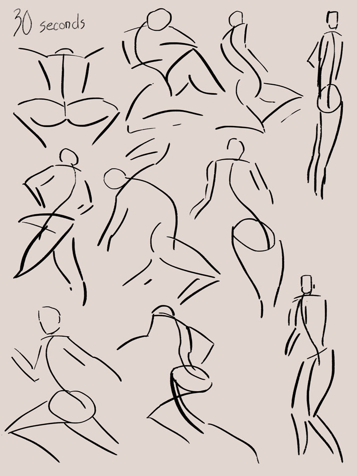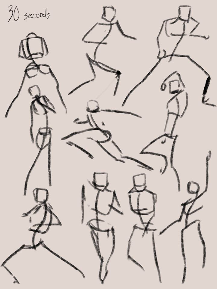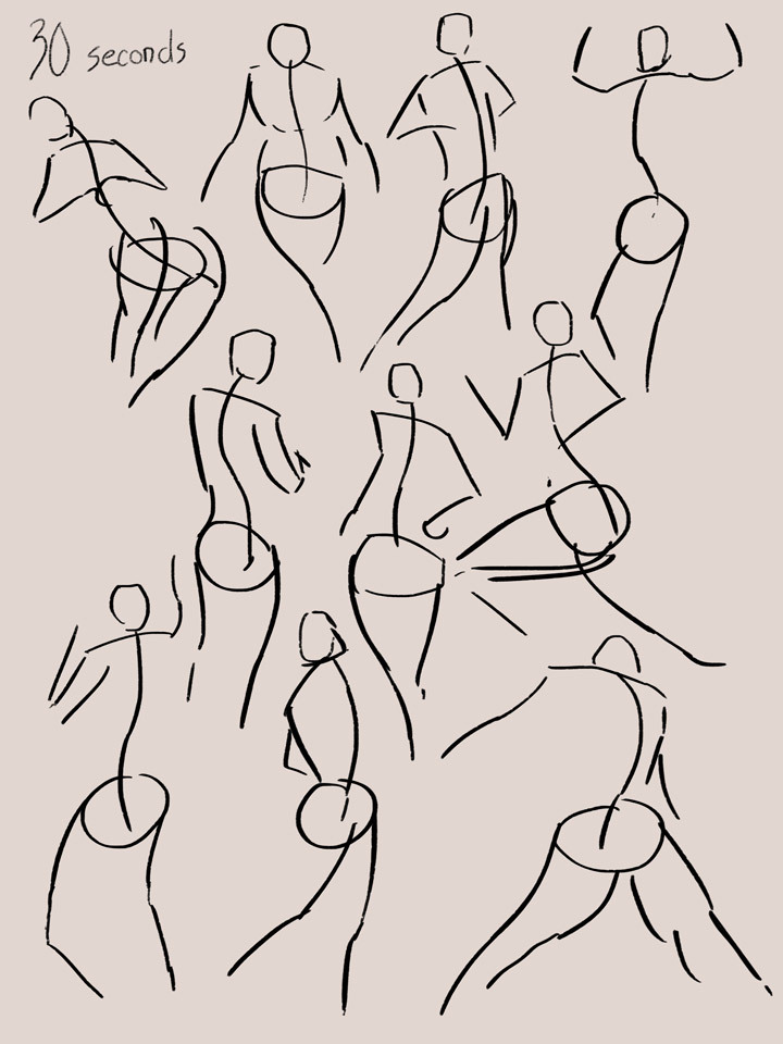 In the hopes of improving my figure drawings skills I started to do daily sessions divided into 4 parts. 10 minutes of 30 seconds drawings, 10 minutes of 1 minute drawing, 10 minutes of 5 minutes drawing and a full 10 minute drawing. Here's the result of the first session. It's really hard XD