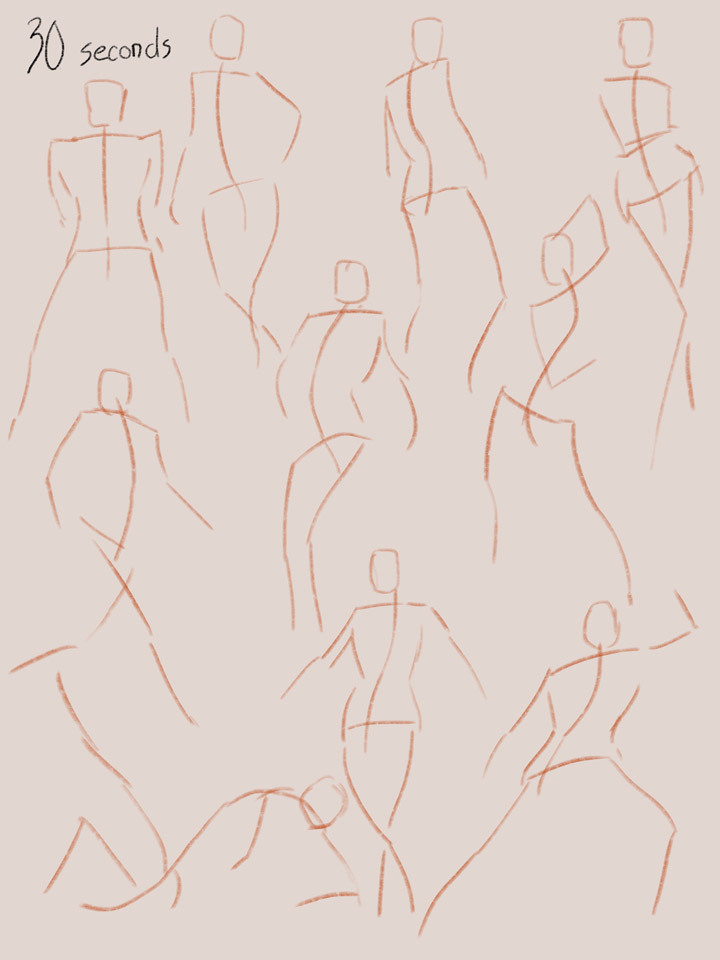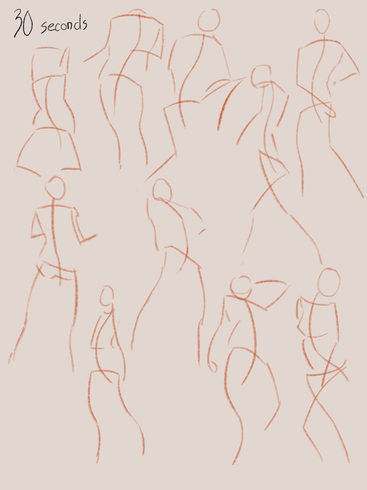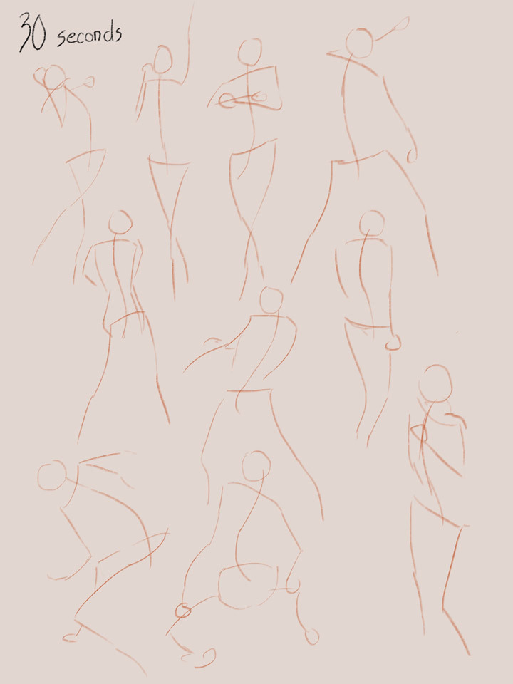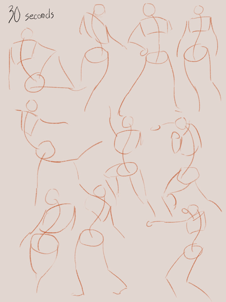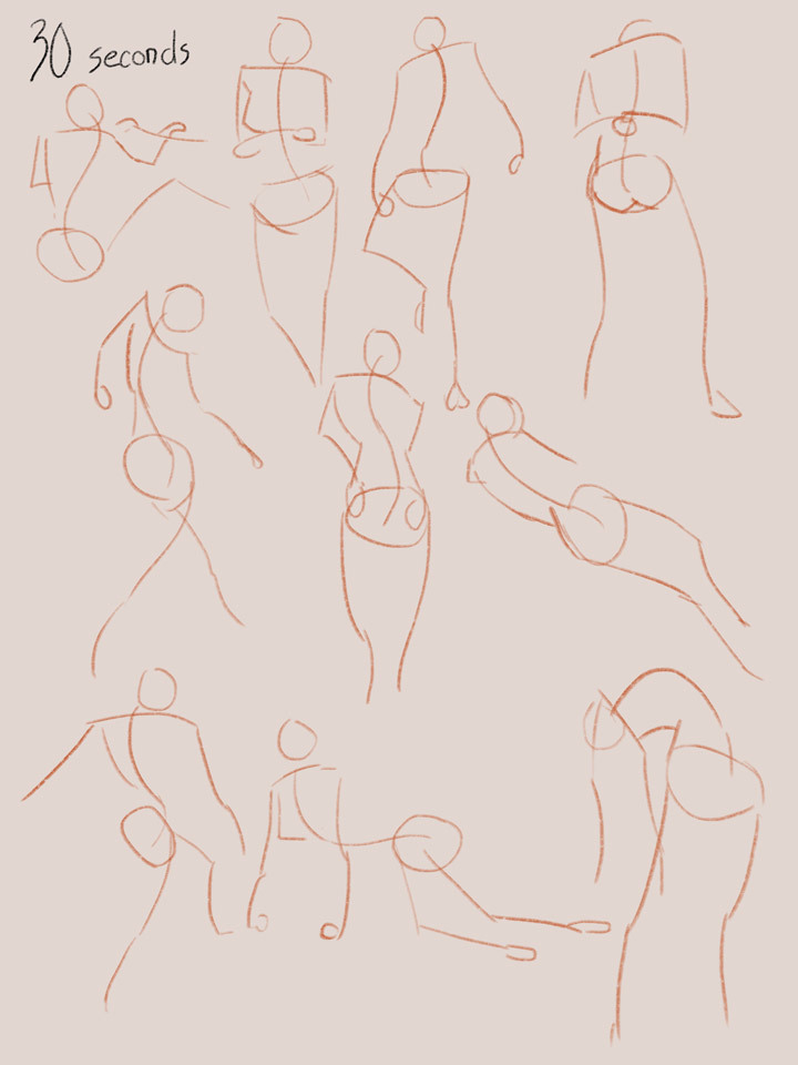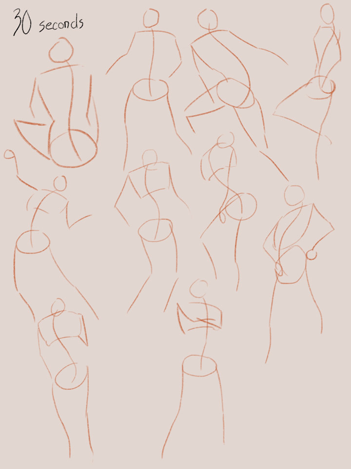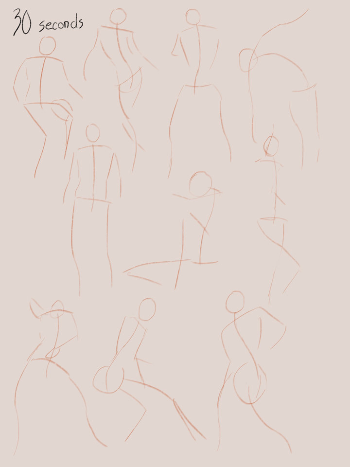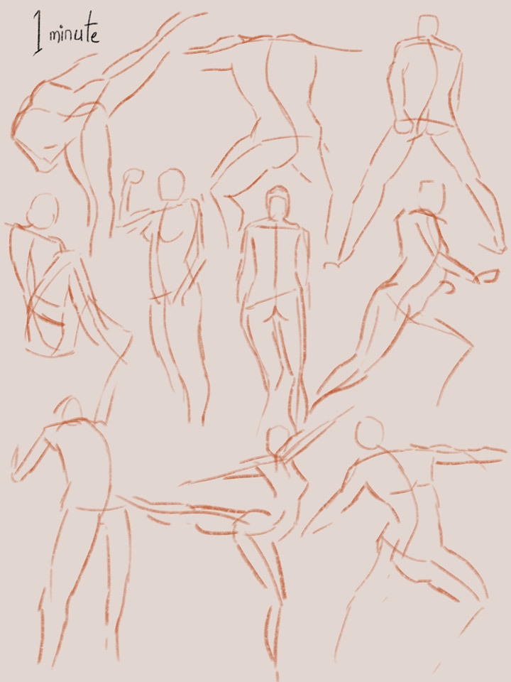 In the hopes of improving my figure drawings skills I started to do daily sessions divided into 4 parts. 10 minutes of 30 seconds drawings, 10 minutes of 1 minute drawing, 10 minutes of 5 minutes drawing and a full 10 minute drawing. Here's the result of the first session. It's really hard XD