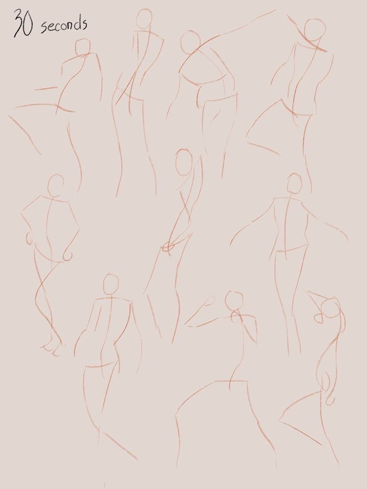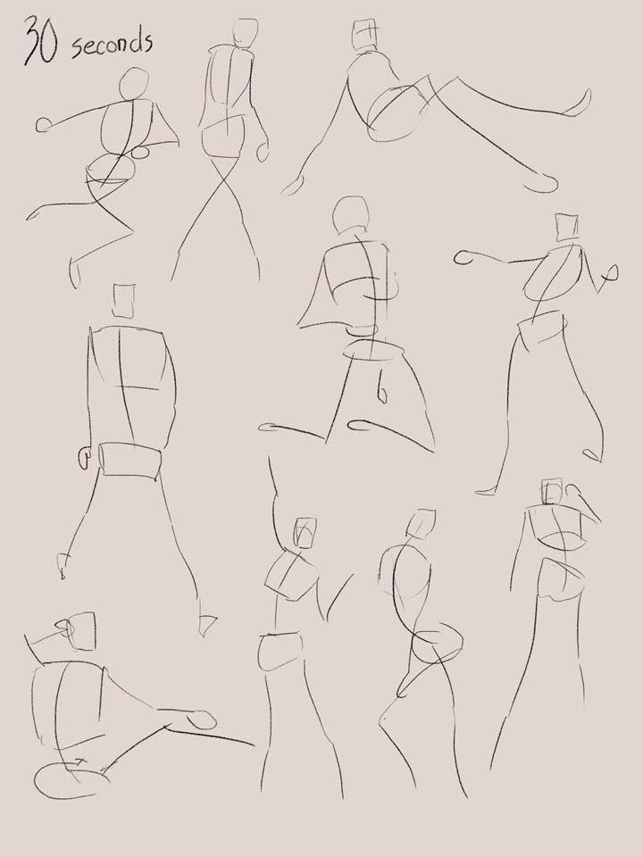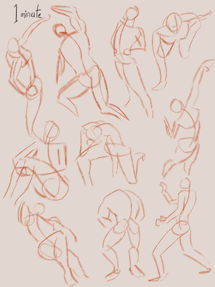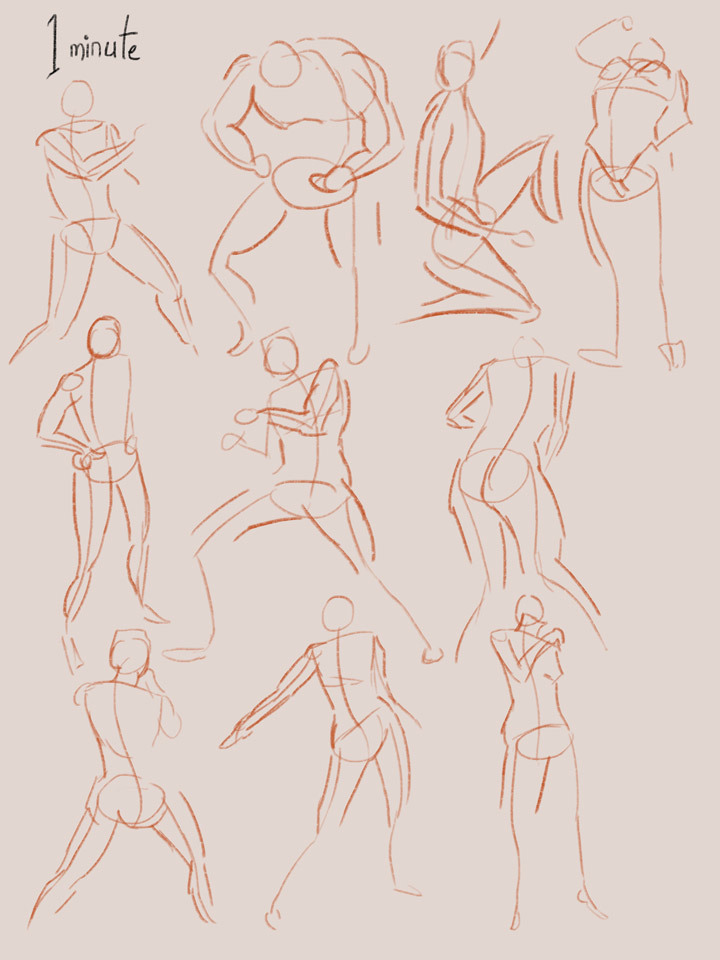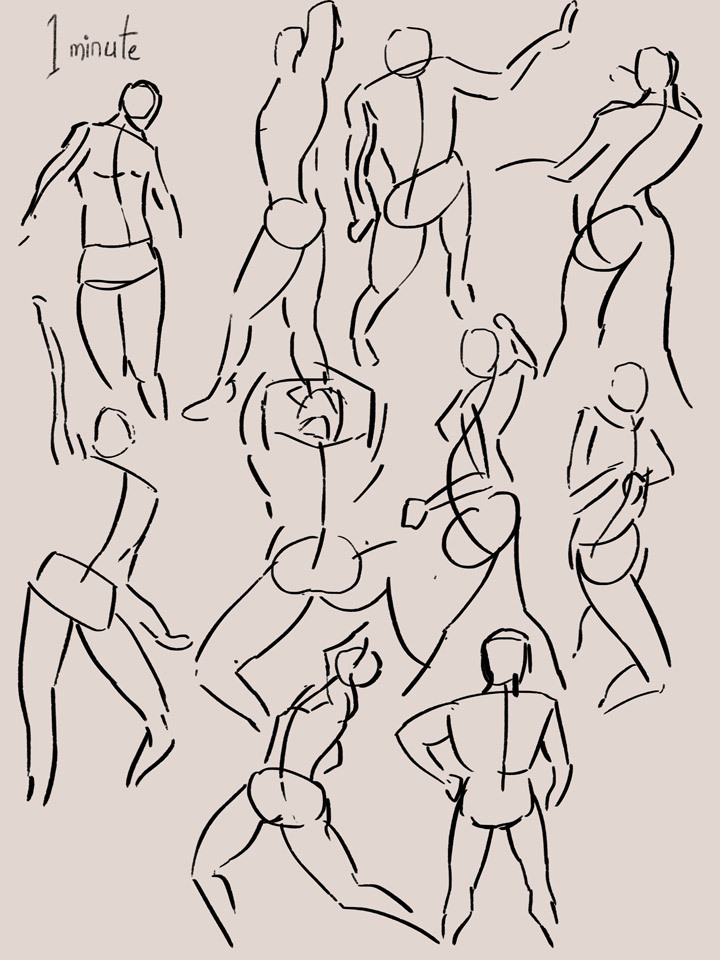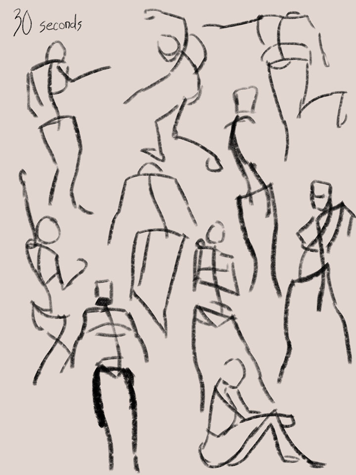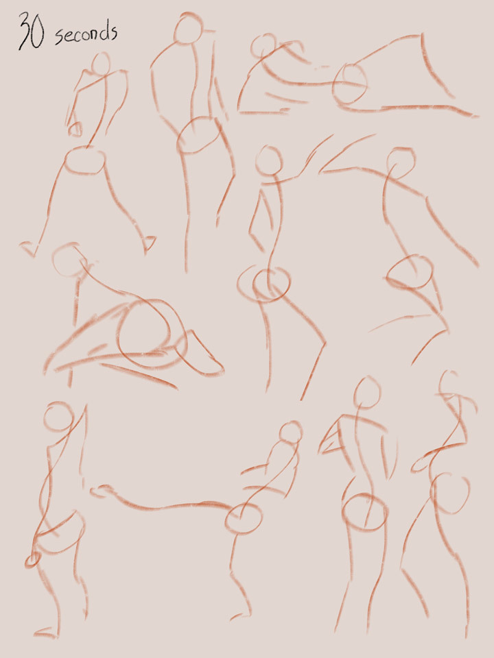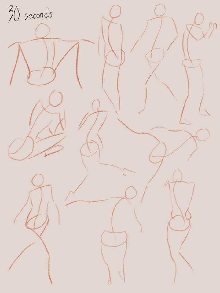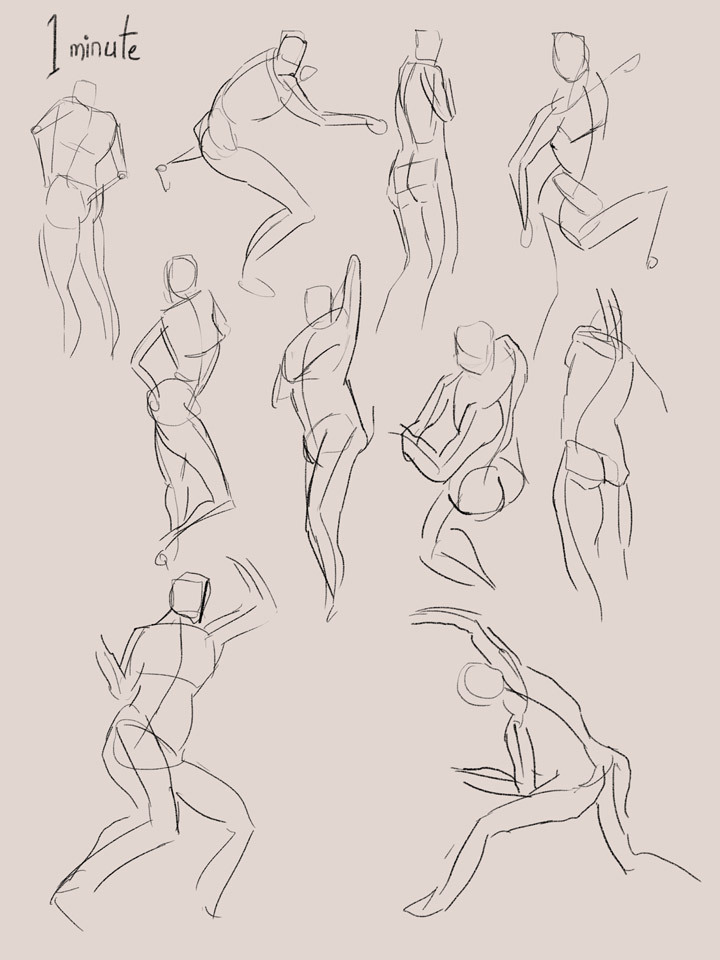 In the hopes of improving my figure drawings skills I started to do daily sessions divided into 4 parts. 10 minutes of 30 seconds drawings, 10 minutes of 1 minute drawing, 10 minutes of 5 minutes drawing and a full 10 minute drawing. Here's the result of the first session. It's really hard XD