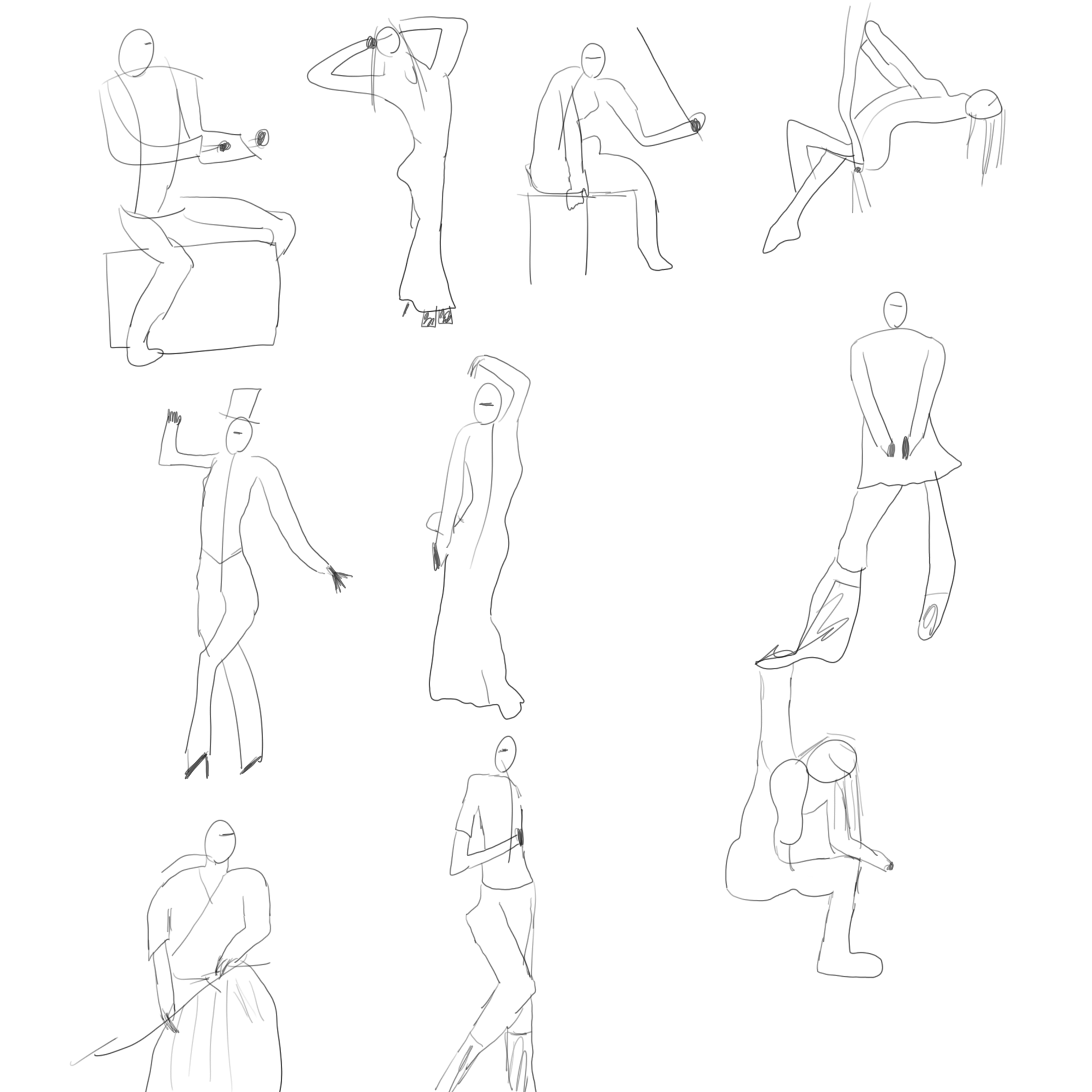 With short gestures that are a minute long, the goal is to create lines that capture and imply movement, rather than copying the pose's exact proportions and angles. I recommend pushing the curves and lines created by the motion of the body rather than the outlines. It'd be good to practice finding the stretch and compression of a figure.