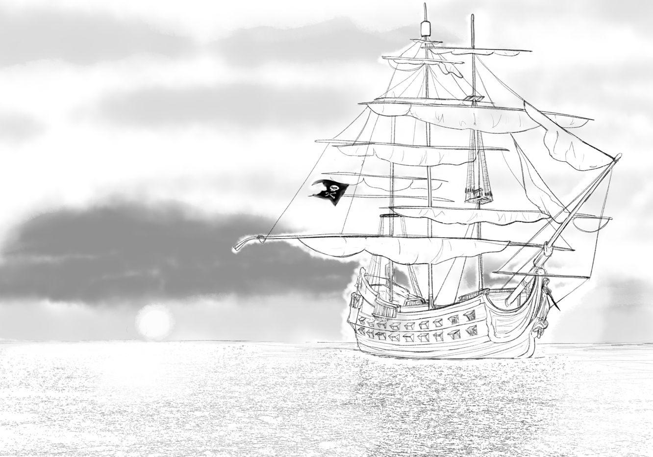 It's interesting how you can actually tell a piece is from an artist as you start looking into the finer details. Not sure who the artist is for this one, but there are many small details in here that are not evident at first glance, like lady with the sword at the helm, which is more detailed than it seems, or how what at first glance seem like shadows of a rail, are actually shadows of people. How the different pieces, like all the ropes interesect and connect logically and are not just random lines thrown about.