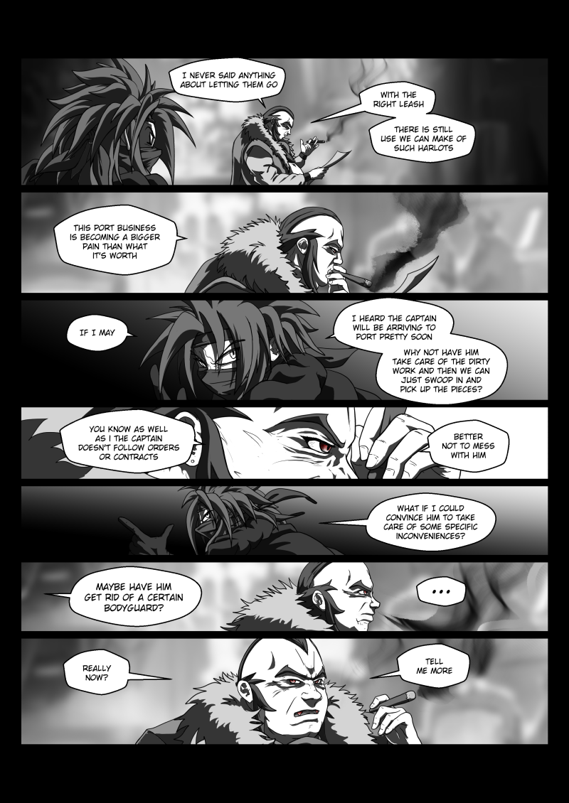 2) The dialogue here was originally very different, I changed it almost last minute as I felt this was more appropiate and forshadowed following events better. Originally, with the same page art and structure, the conversation was around how there's a mole or traitor among the mafia group, but I felt this kinda didn't fit the situation and would be better used later. This feels more relevant for what the reader has seen so far and also adds context and setup for what is to come.