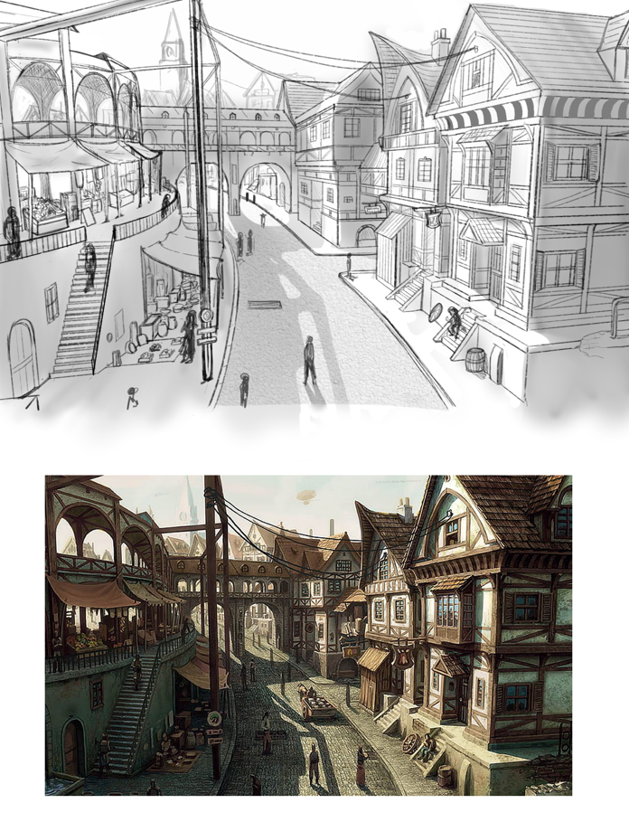I will say, this did force me to analyze the actual strcuture of the buildings. Like, what is the structure of the street under the tents? The walkway on the background that crosses the street seems to connect the building on the right with the plaza on the left. How do they connect?