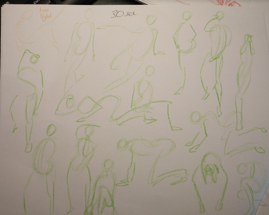 After I finished reading and watching the above video, I warmed up by practicing my line art, and then I gesture drew in 30 and 60-sec intervals.