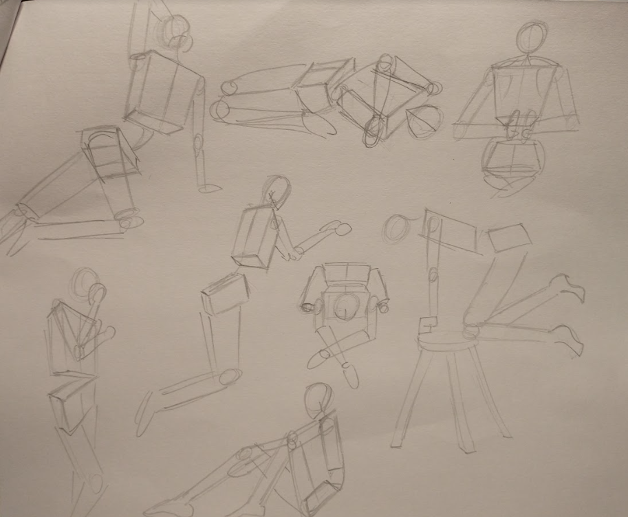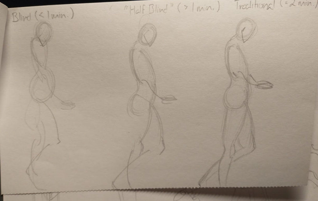 Next, I practiced some more gesture drawings but with no specific time constraint, though they roughly took about 2-3 minutes. Here, I focused on the construction of the arms by drawing a curve adjacent to a straight line and vice versa.