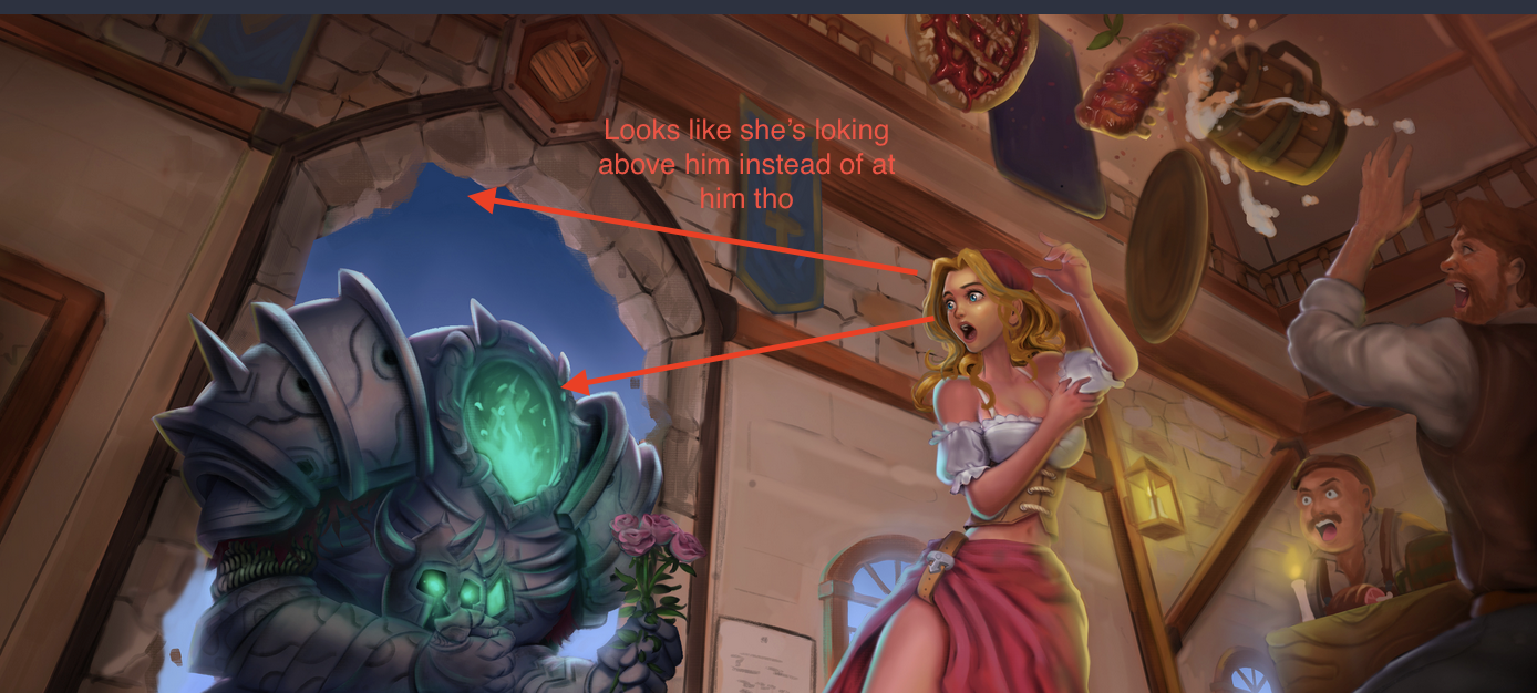 For the maid, her right hip is attracting a lot of attention as there's a lot of contrast there. I feel like toning this down a bit and increasing the constrast on her face would help.