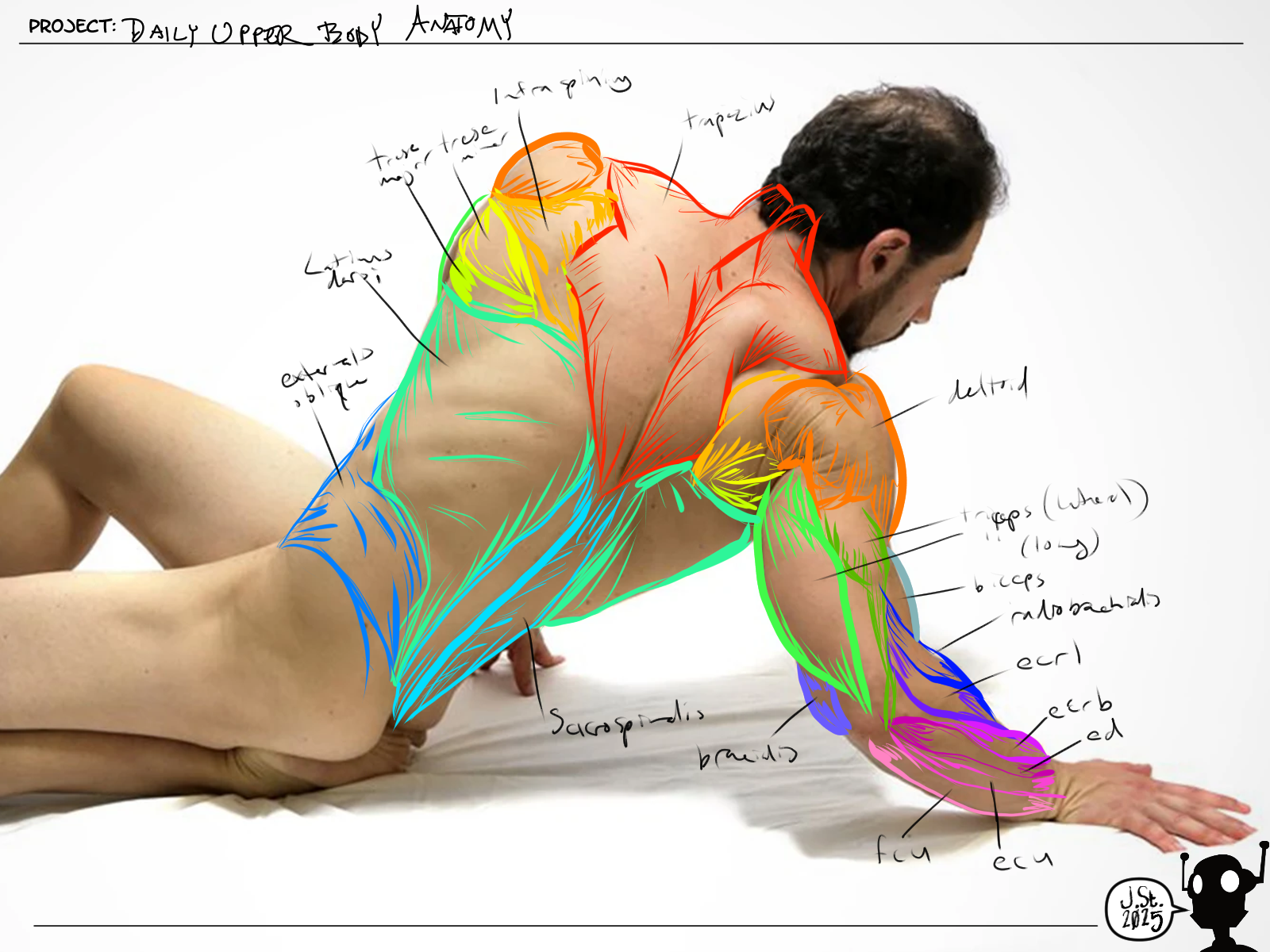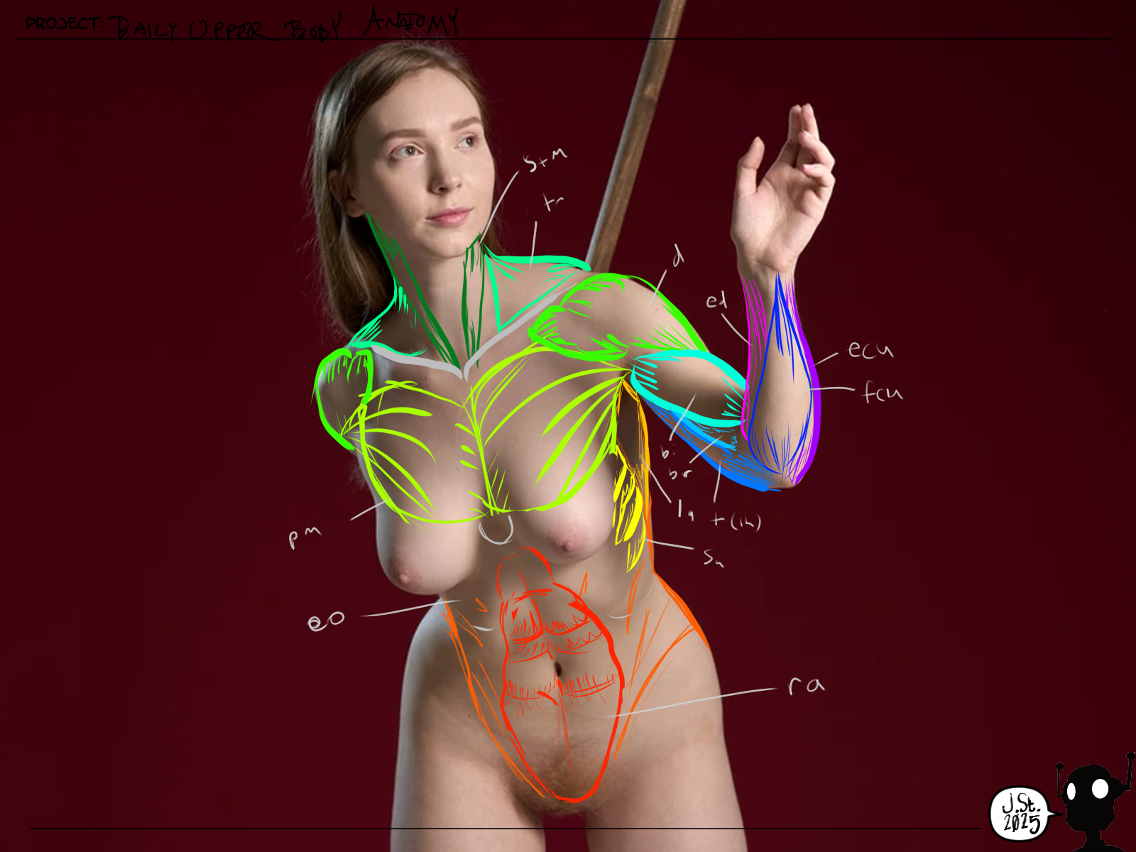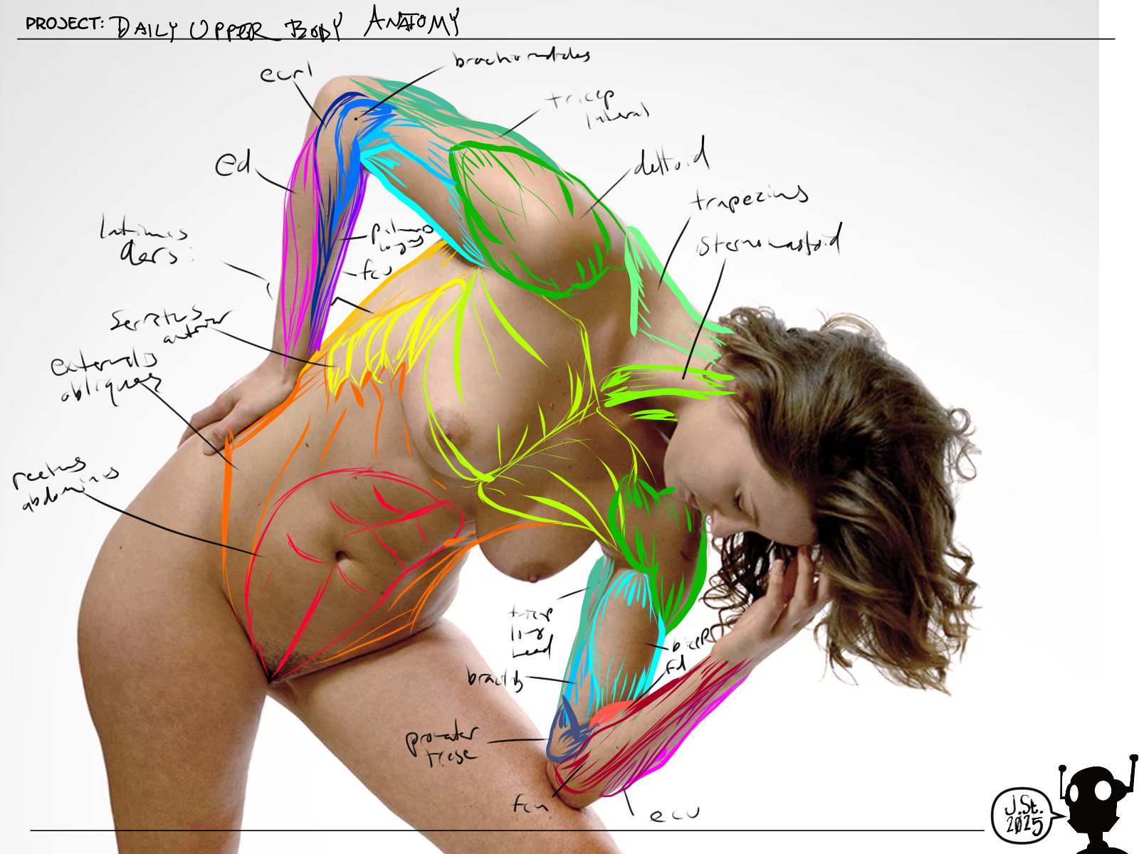 This was also pretty fun. Trying to puzzle out those forearms was a really hassle - AKA opportunity for future learning. This image seems pretty accurate in terms of anatomical correctness (I think?), it's my lack of knowledge here that really handicapped me.