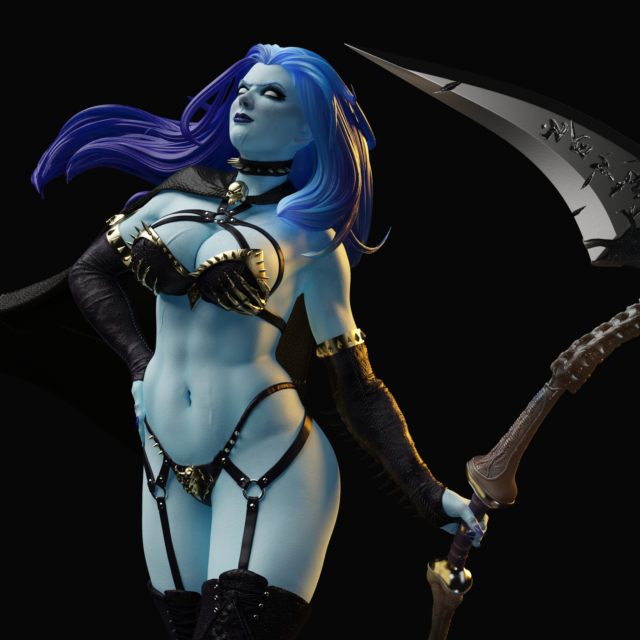 The visual approach is more a personal interpretation of Lady Death, for this reason I moved away from the traditional way this character is depicted. The clothes not only work as an erotic/sexy outfit, they also reinforces the idea that she is a supernatural warrior by using a leather armor with a few metal ornaments.