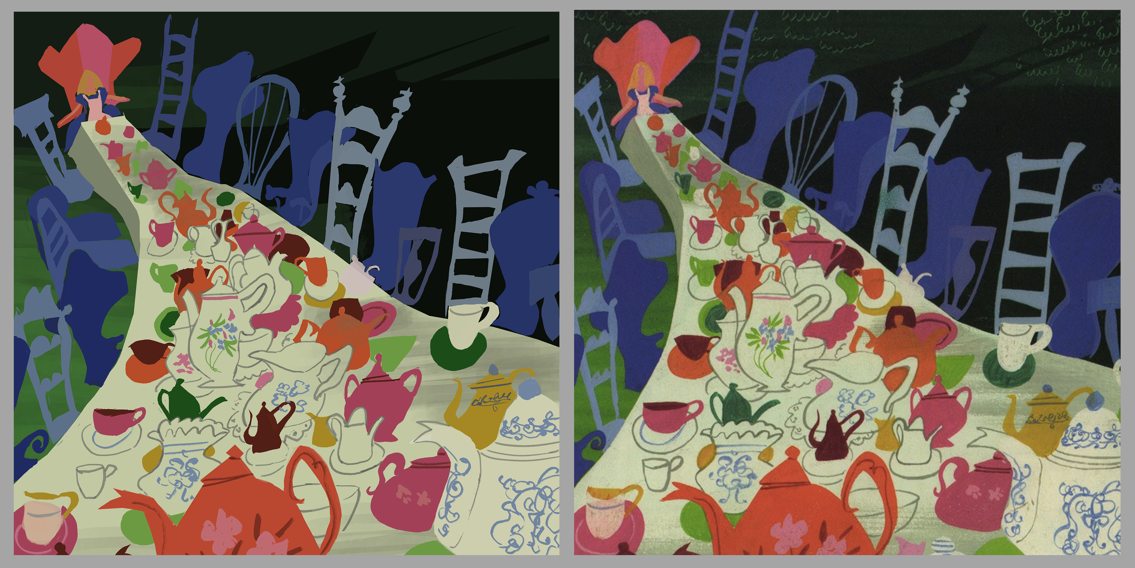 This is concept art for DIsney's Alice in Wonderland by Mary Blair (right). I really admire the way she uses shapes and the colors she uses. I really love that this only uses four colors (red, blue, green, yellow) but the varying shades and hues makes it interesting and lively. My goal with this was to see how she uses color and shape. In Feb I'm going to take what I learned and create an original work based on it.