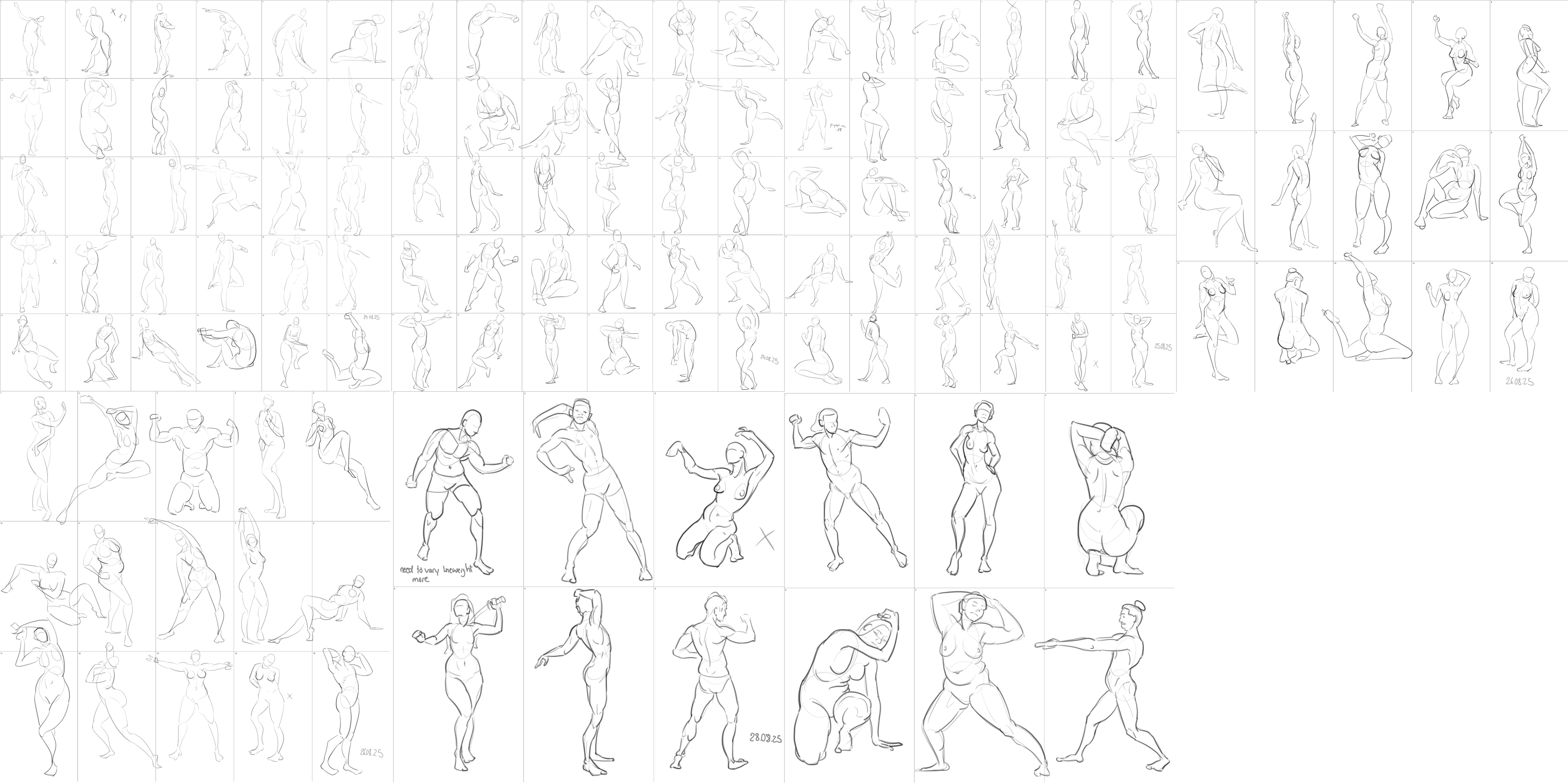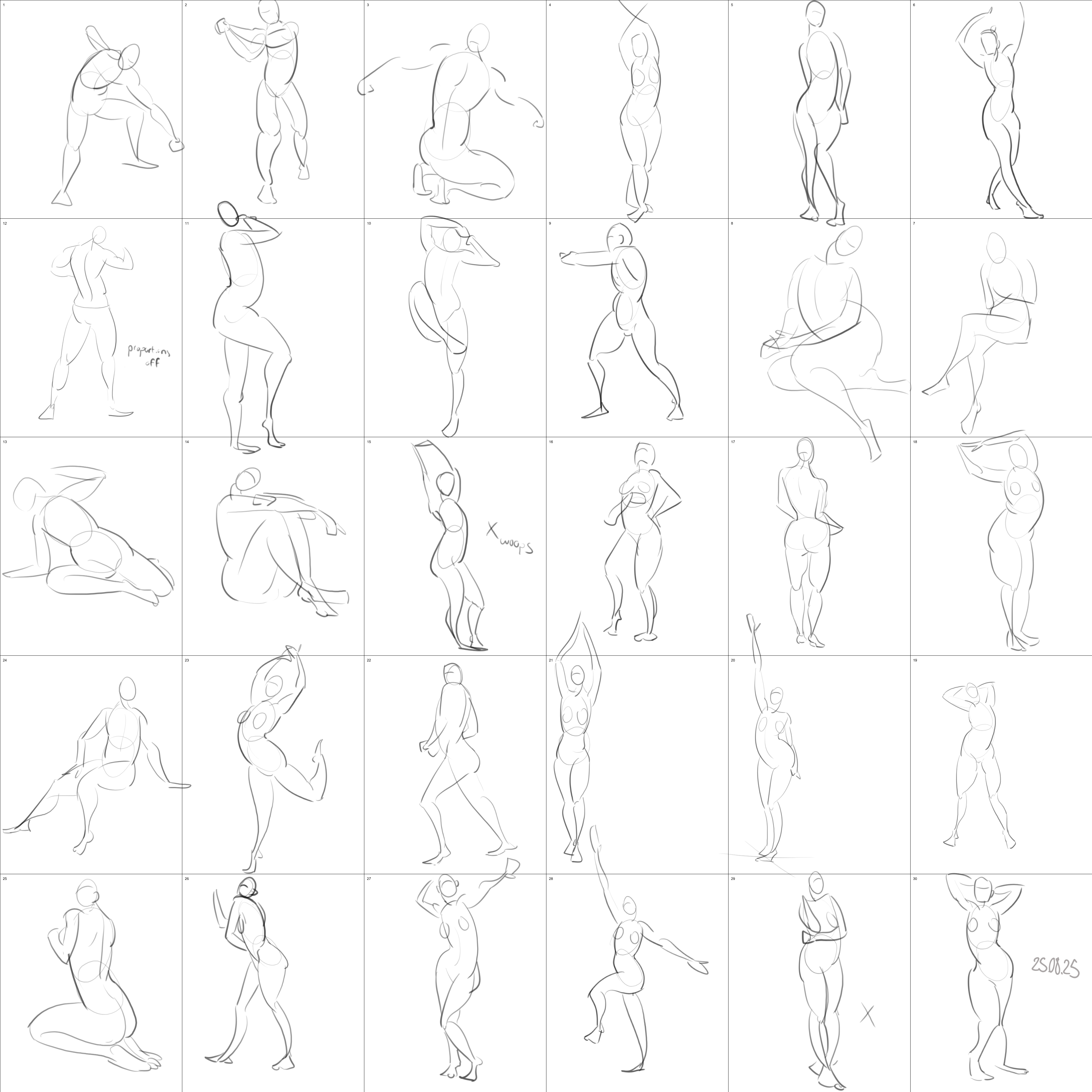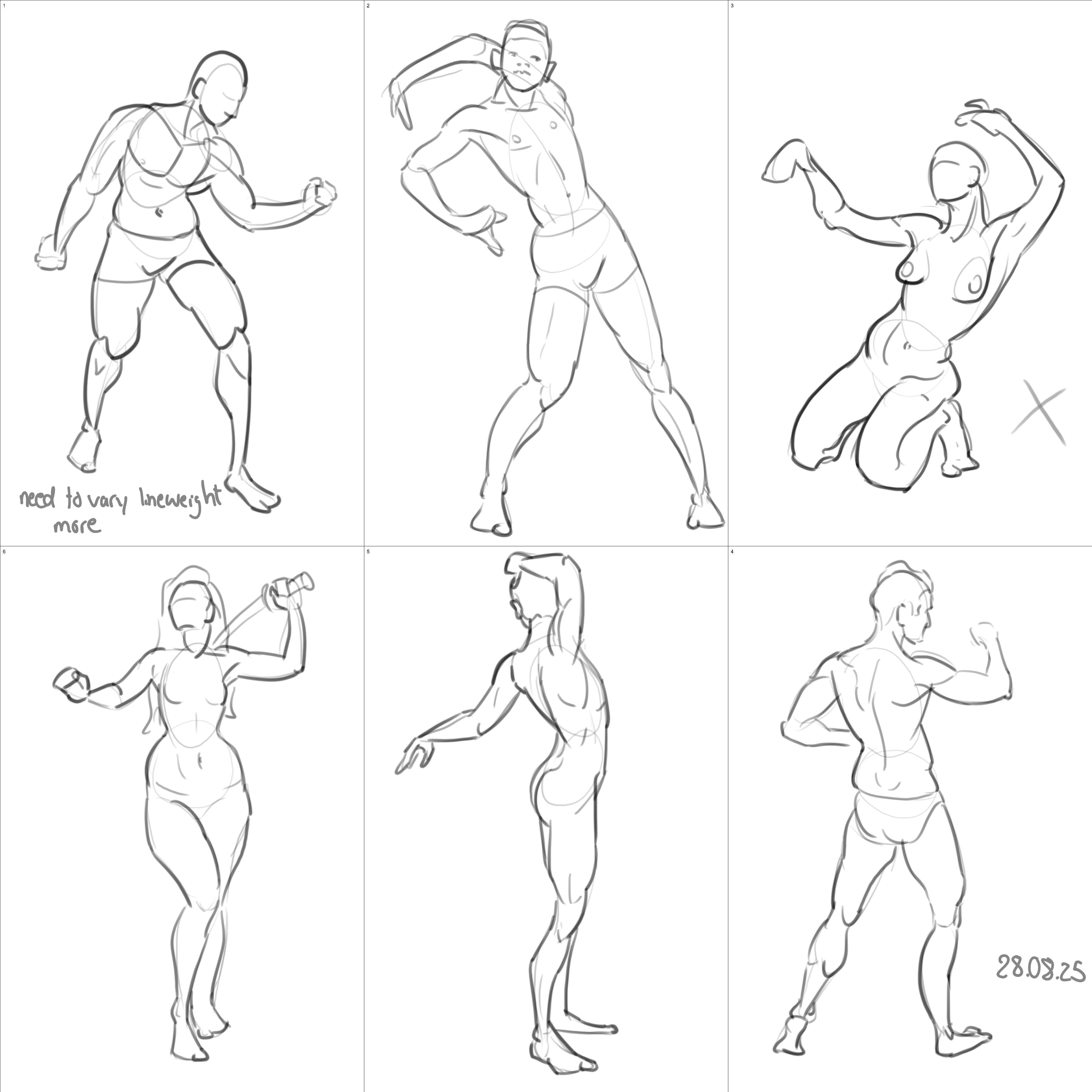 Third, as you progress through the course, you will do lots of gesture. Look at these as an opportunity to revisit all the other topics that you want to brush up on. I tend to make a session about a specific thing. For example, I noticed that your last set of gestures tend to have smaller heads, so maybe with your next set really focus on nailing proportions before noodling on the silhouette. I've been working on trying to incorporate things like facial features once I make a pass over the figure.