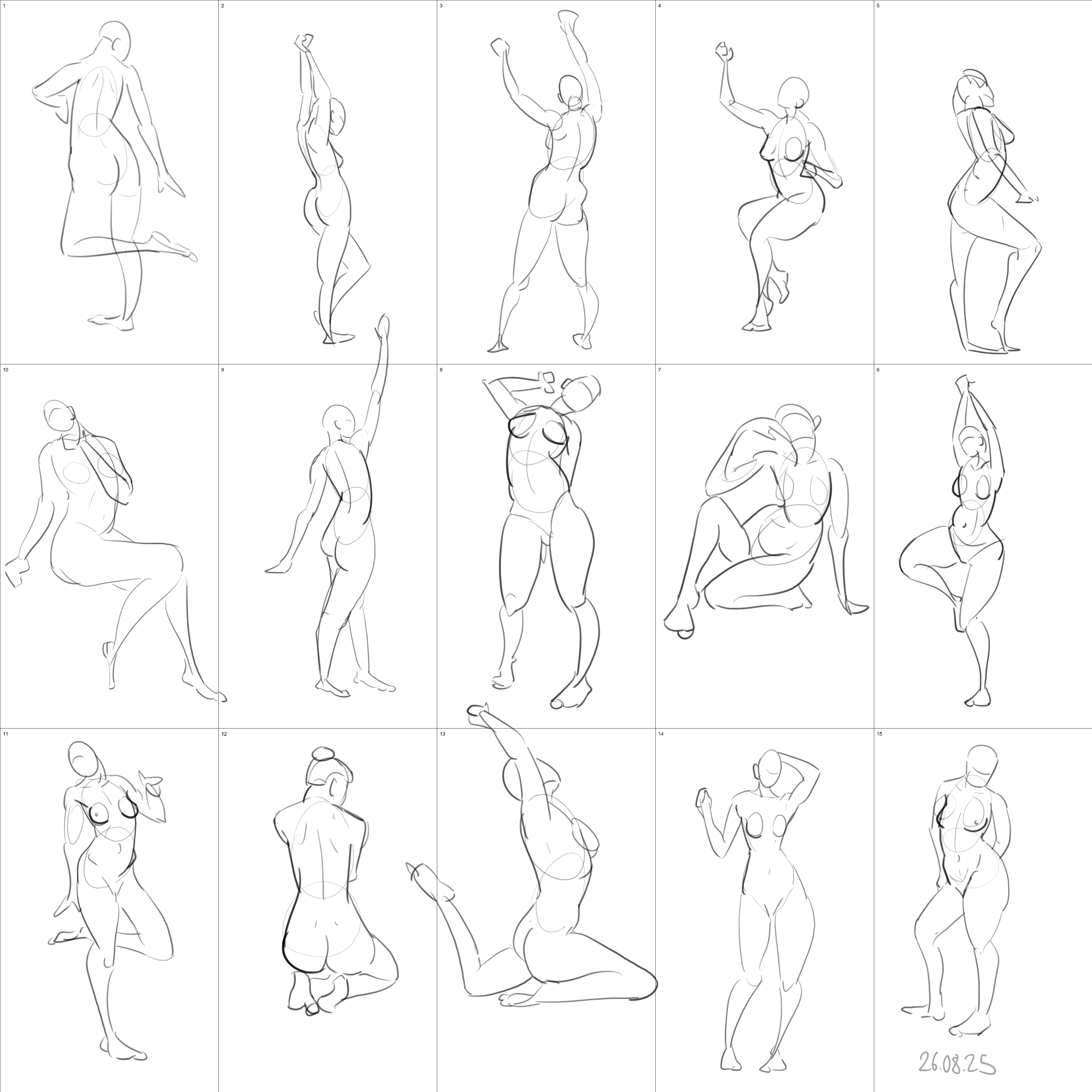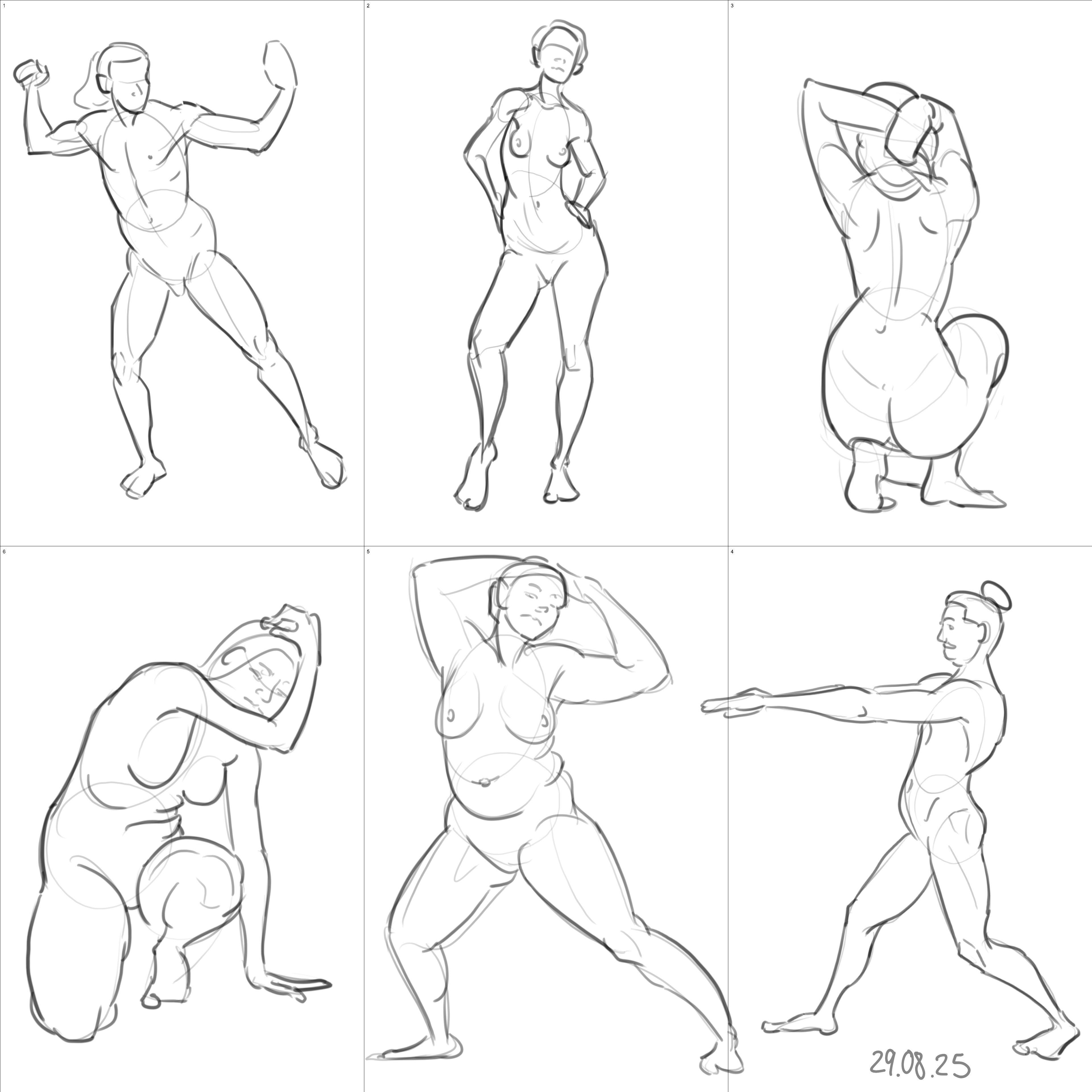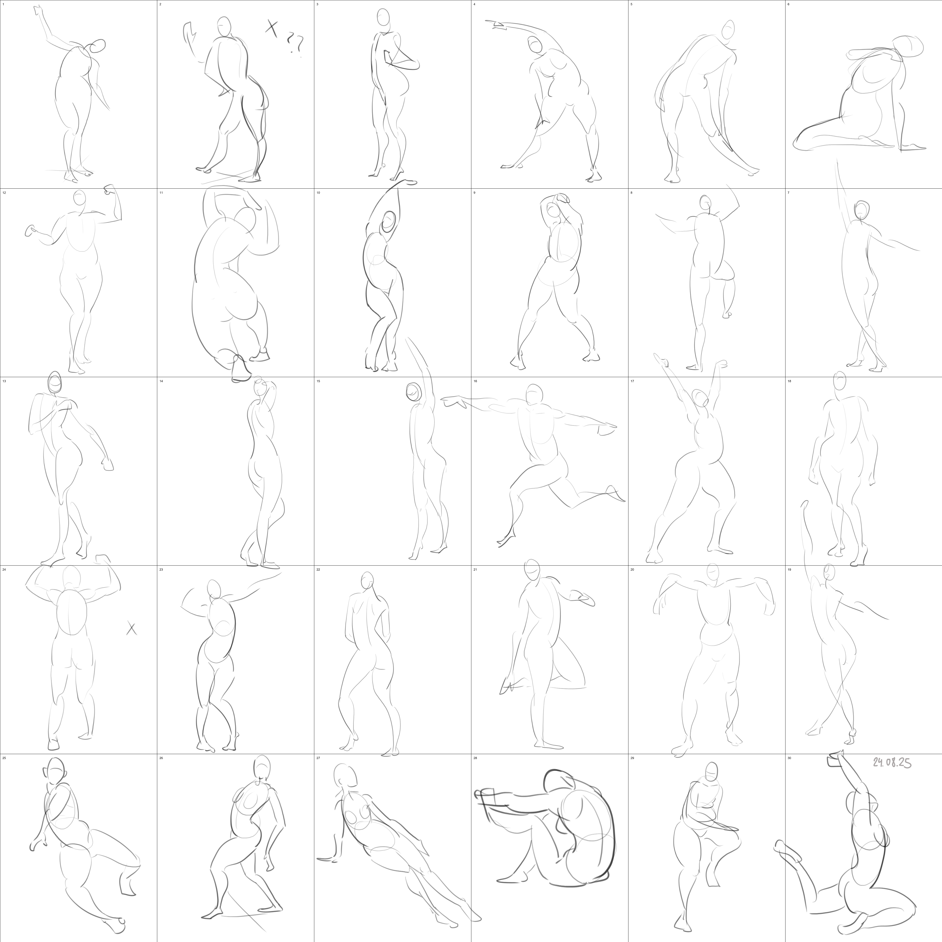 Third, as you progress through the course, you will do lots of gesture. Look at these as an opportunity to revisit all the other topics that you want to brush up on. I tend to make a session about a specific thing. For example, I noticed that your last set of gestures tend to have smaller heads, so maybe with your next set really focus on nailing proportions before noodling on the silhouette. I've been working on trying to incorporate things like facial features once I make a pass over the figure.