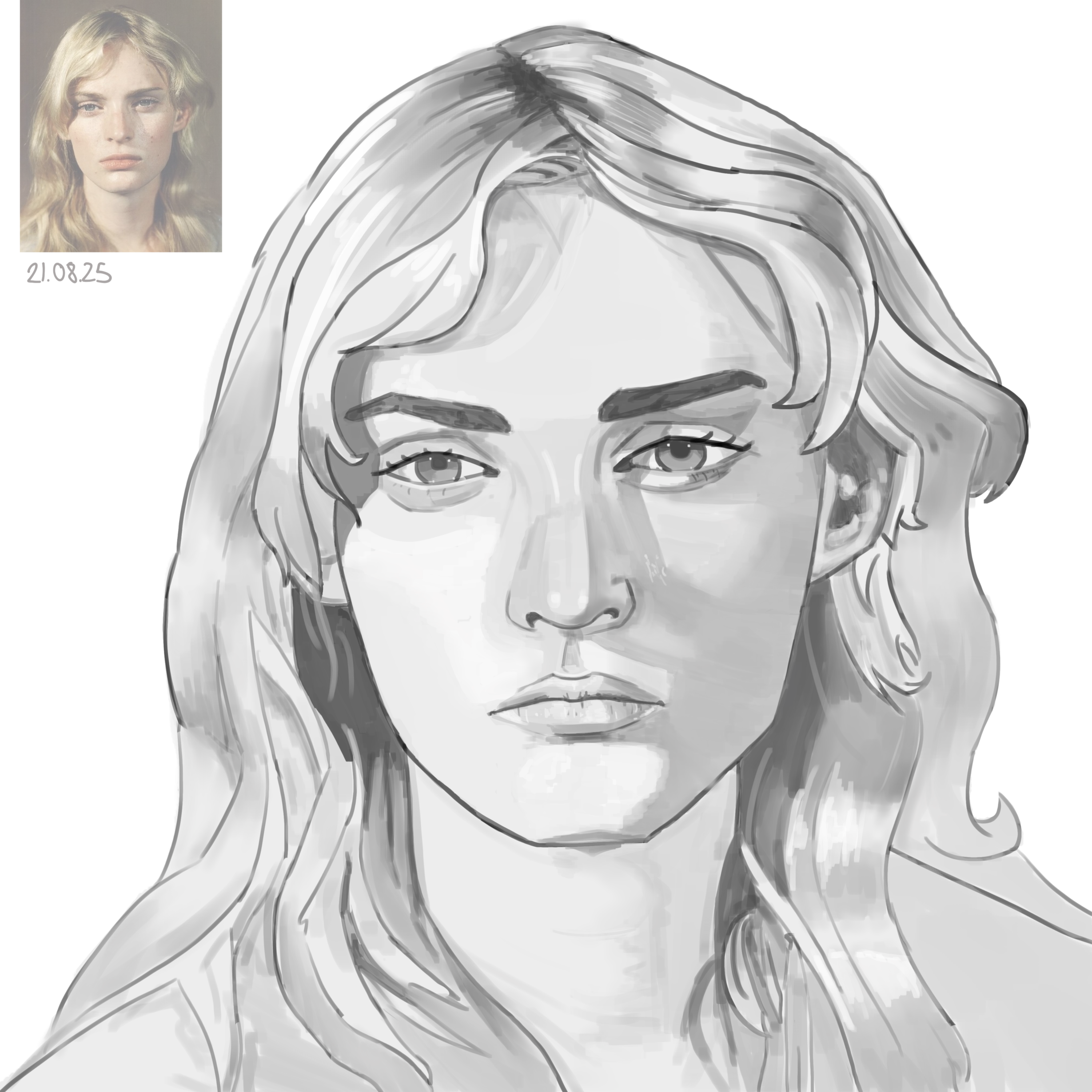 Second, one thing you might want to do with all of your works is to look at line weight and how that can be used to define a hint of shadow or weight in your lineart. You do have a variety of line weights, but it could be improved by having it help define the form a bit more. In your head studies (which are great btw!), there's a style to use a heavy outline which fights against the line weight difference that you have in place making your drawings appear flat. Try to make the lines at the top of the head (or the form turning towards the light) have a lighter/finer line and the form turning away from the light (going into shadow) have a thicker width. I use a 20px brush with pressure set to control size, but not opacity. I think you could even just go over the top lines with a 10% opacity eraser to lighten them and see what I mean.