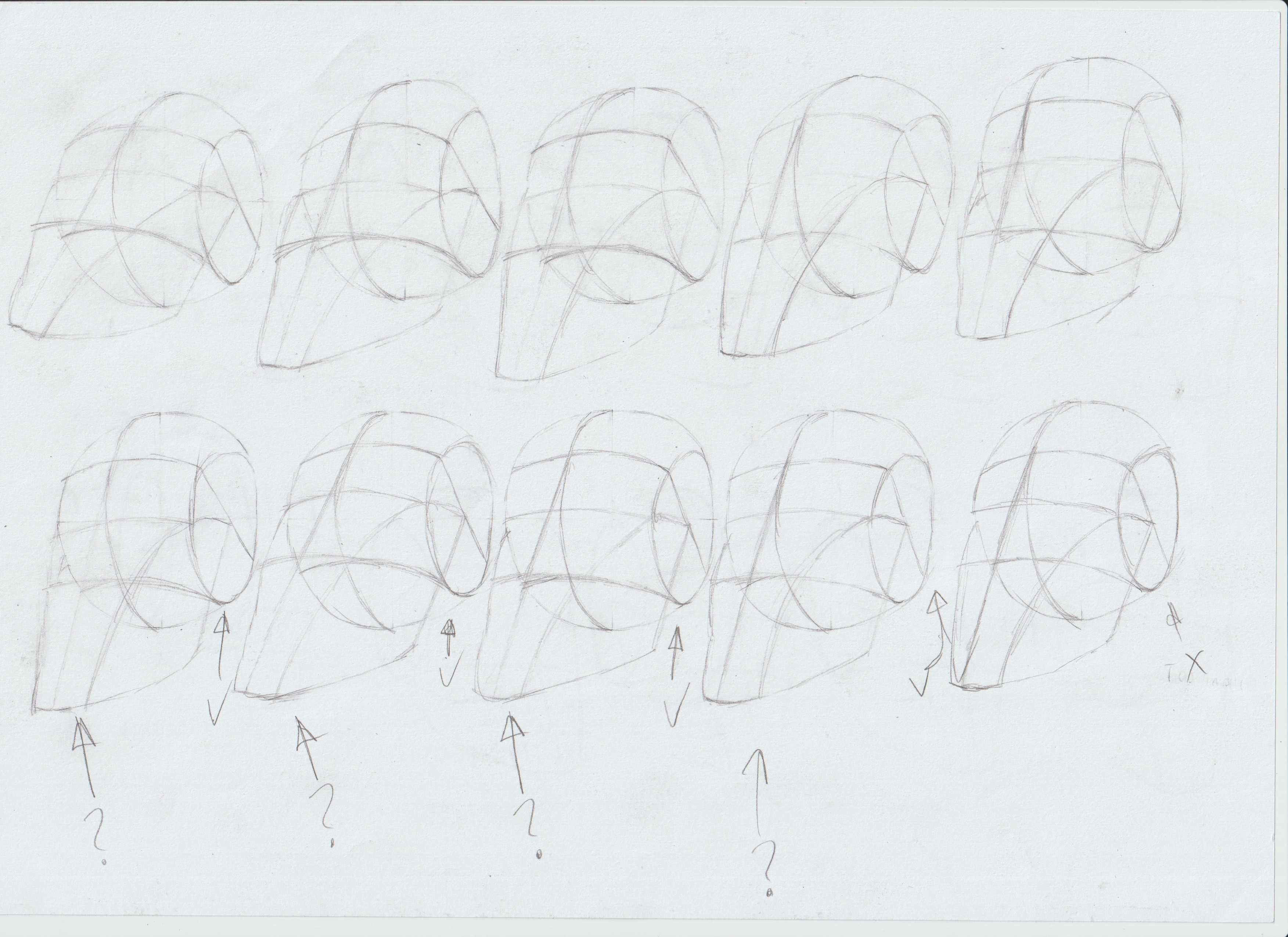 2. regarding the proportions of the head: you can also create your own feedback loop by taking a reference image of a head, construct it 1:1 by measuring out the proportions and landmarks and regularly double check them.