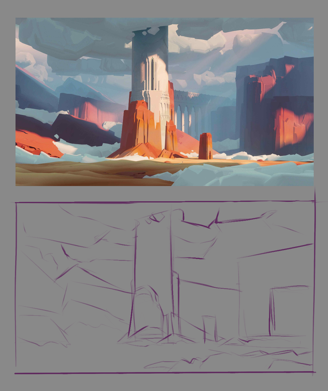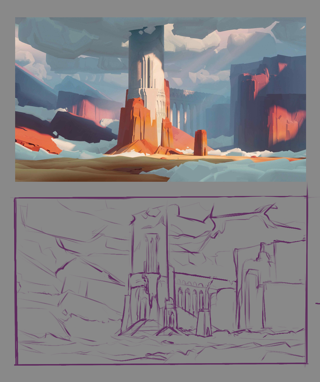 Looking at the current stage now, I can see some minor issues in my piece with proportional retionships between the main structures in the scene, but nothing majorly, obviously awful, and I think it still looks pretty good so avoiding the perfectionism, I'm just gonna keep on with the cleaner lines before doing my final pass. I'll do a review once done, lessons learnt, then apply to study number 2.