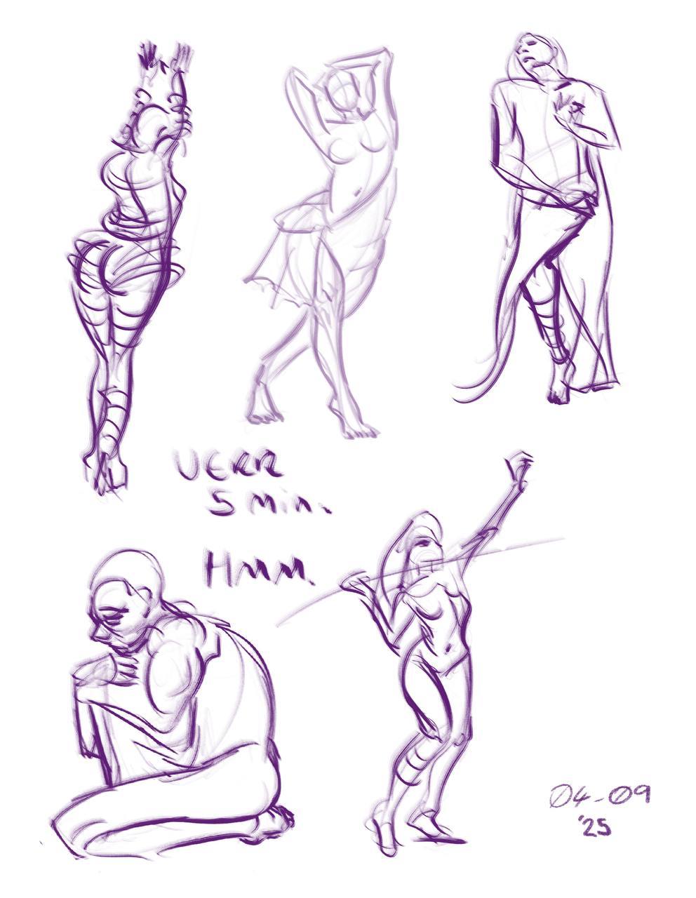 Your five (5) minutes poses are getting there. You are adding some actual structure to the initial sketching 30 second gesture. But you are also adding some anatomy which can start adding much detail and be distracting. It is not bolstering the motion and composition of the figure - it is rushing to finish.