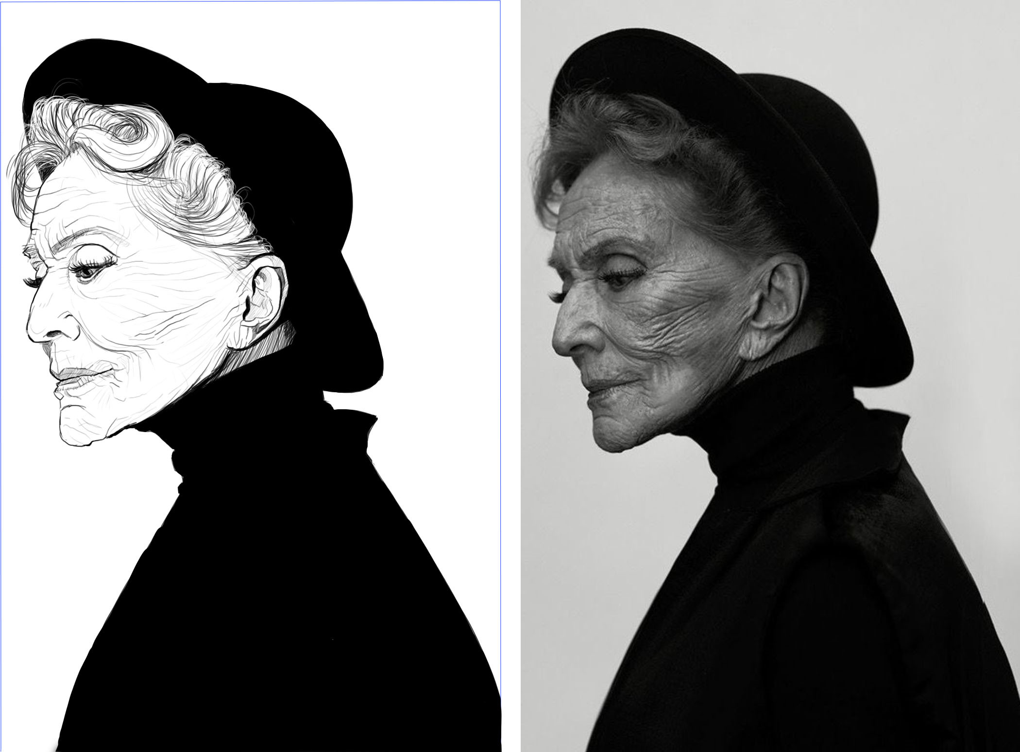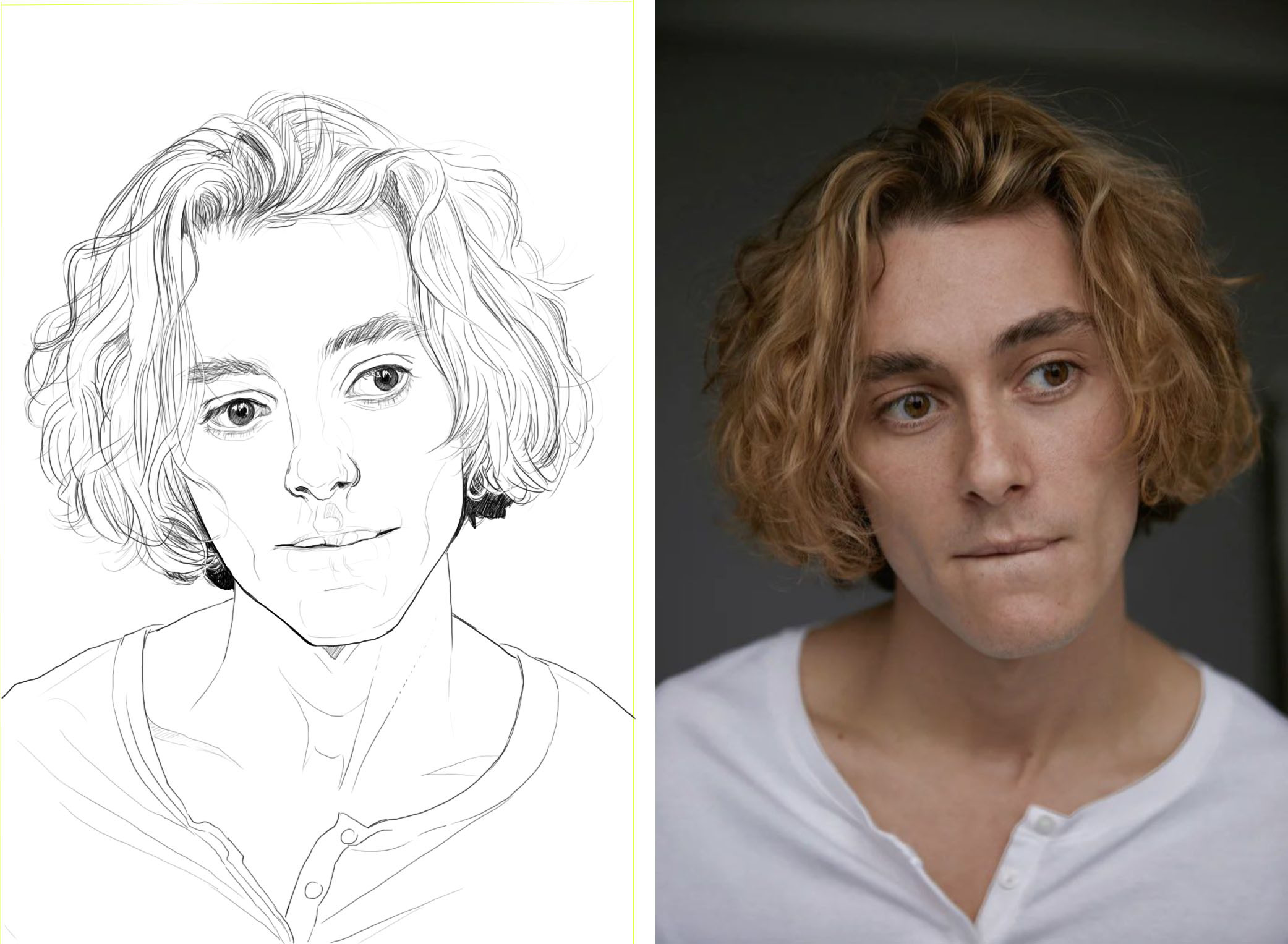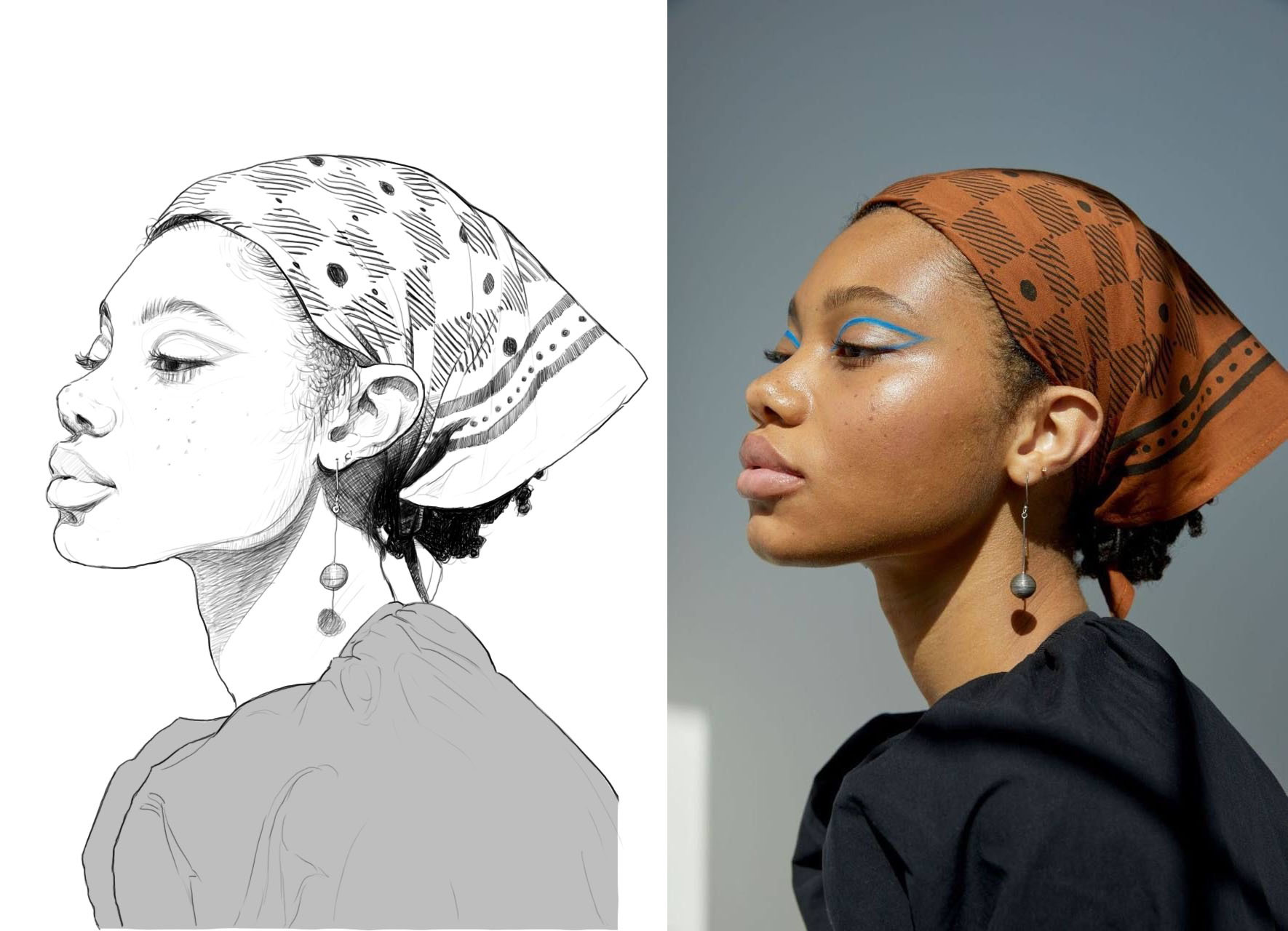 Now it felt more like studies, in stead of just copying something into a grid. As a total controlfreak this was terrifying and frustrating haha, yet a good practice. For the same reason to keep my perfectionism to a minimum, I used unknown models in stead of known actors and singers. This way it's less "disturbing" if the drawing deviates from the photo.